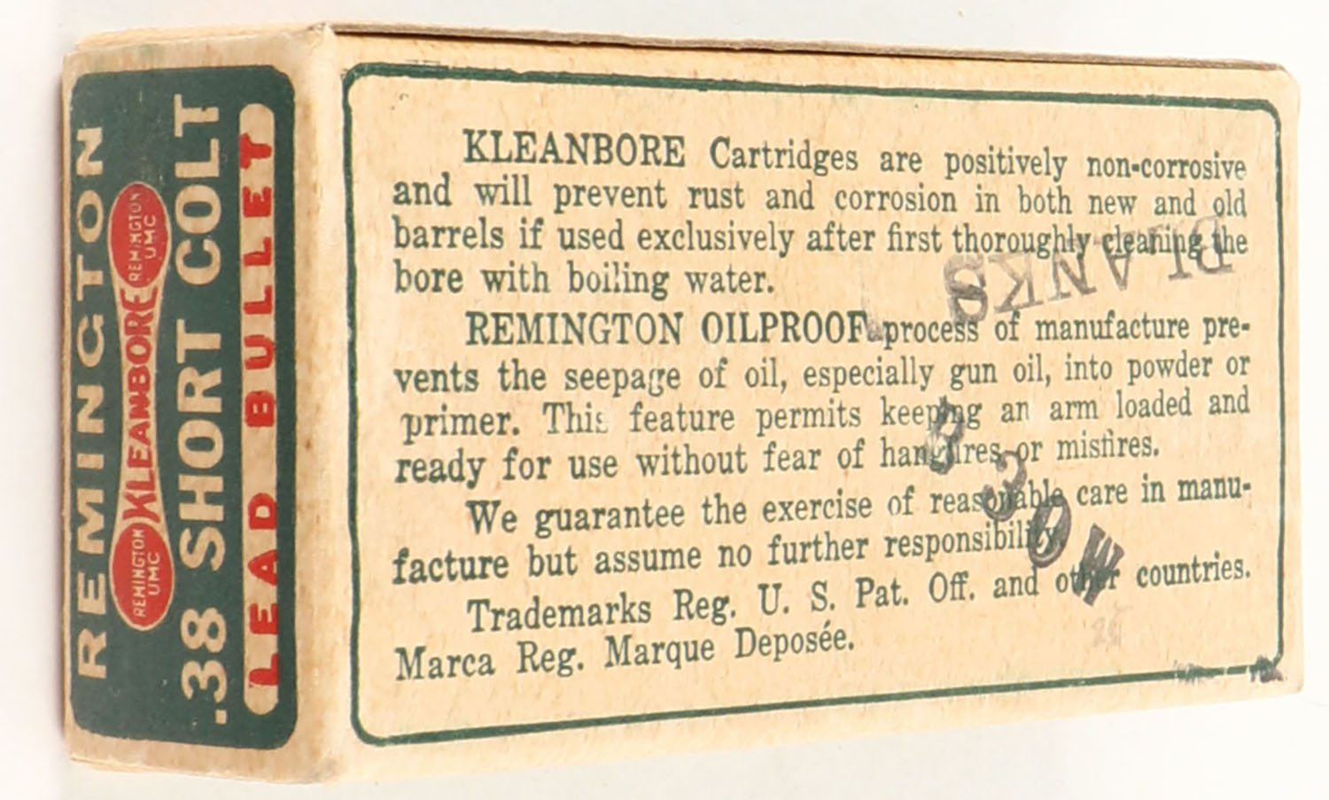 Remington, Kleanbore Motion Picture Blanks, .38 Short Colt, Full, 1pc. Green buff & red dog bone box with white over-label, box is solid with excellent color, very minor age soiling & shelf wear, edges are mostly crisp, end flaps are solid, ammo is excellent. Grade: Excellent + - Value: 40 to 200