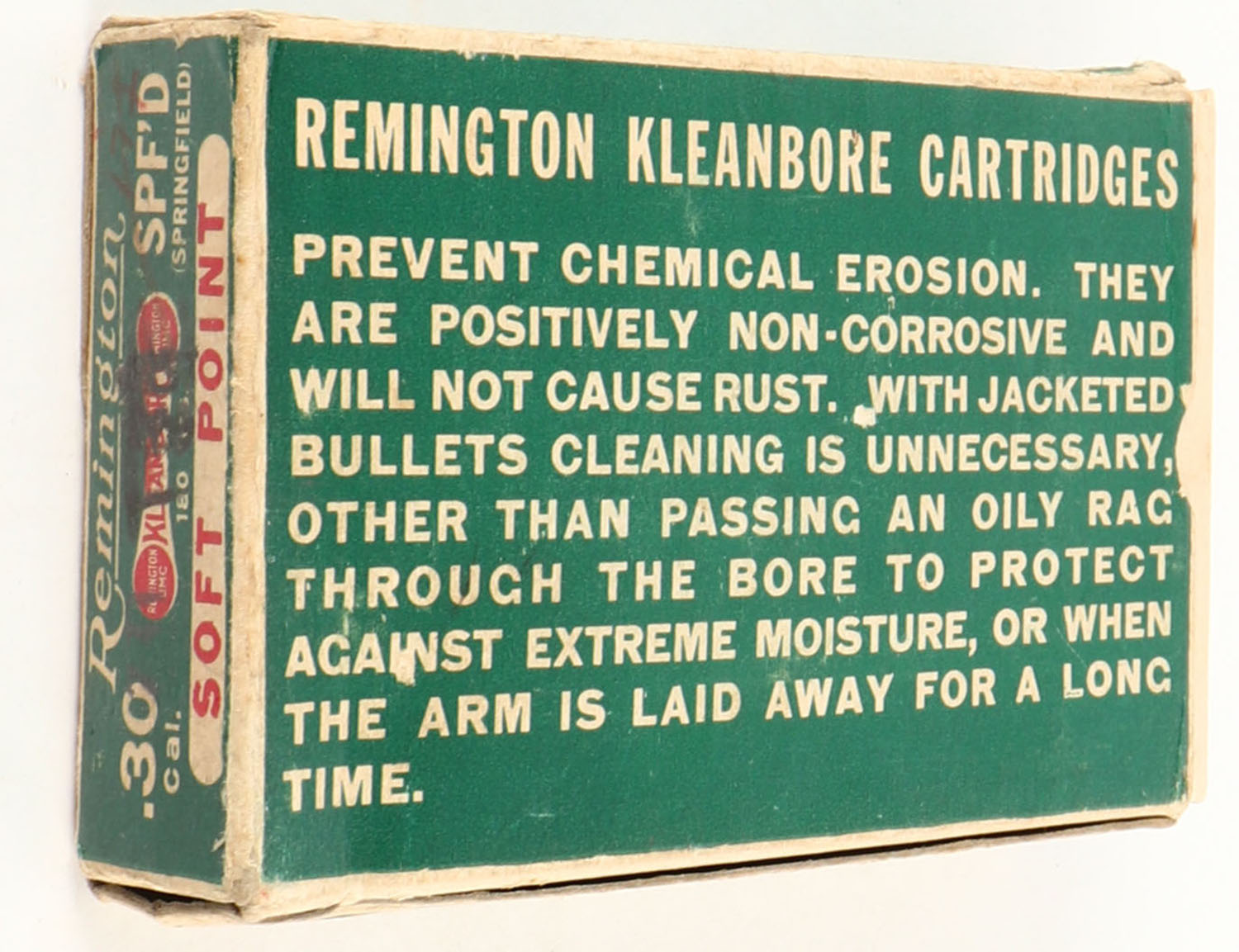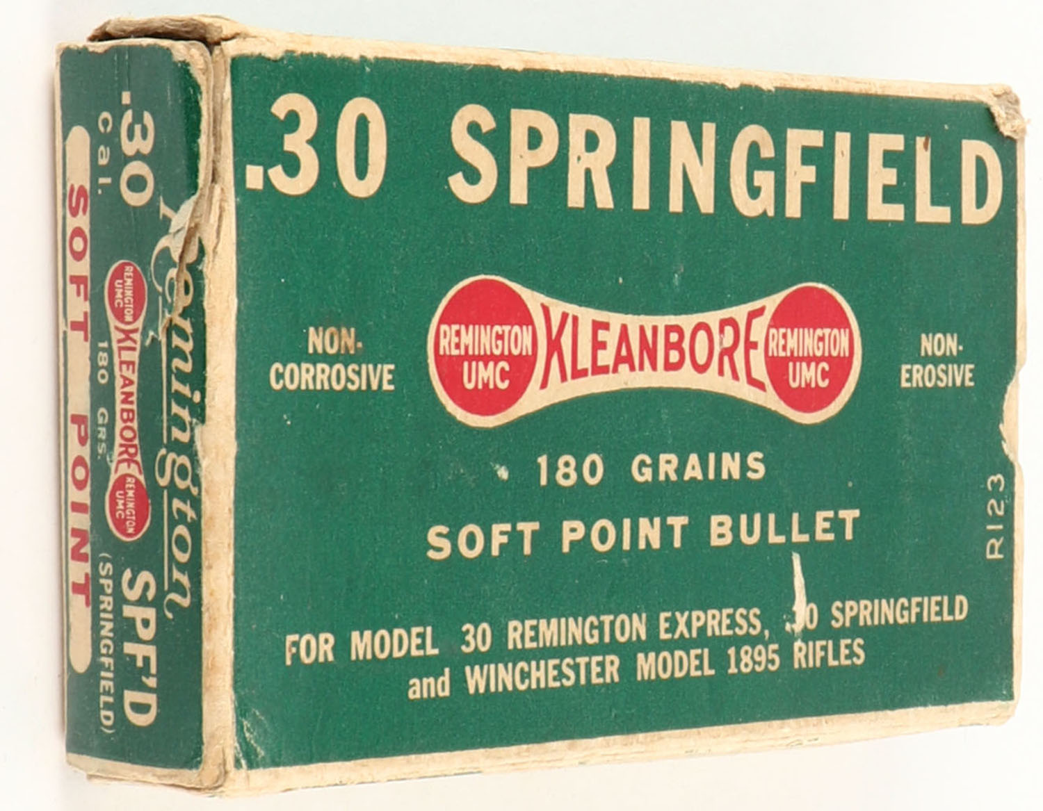 Remington, Kleanbore, .30 Springfield (.30-06), 180 Grain Soft Point Bullet, Partial 14rds., 1pc. Green buff & red dog bone box, box is solid with excellent color, very minor age soiling, partial seam split to right end flap, left end flap has been written on, some edge & corner wear, ammo is good. Grade: Excellent - Value: 6 to 30