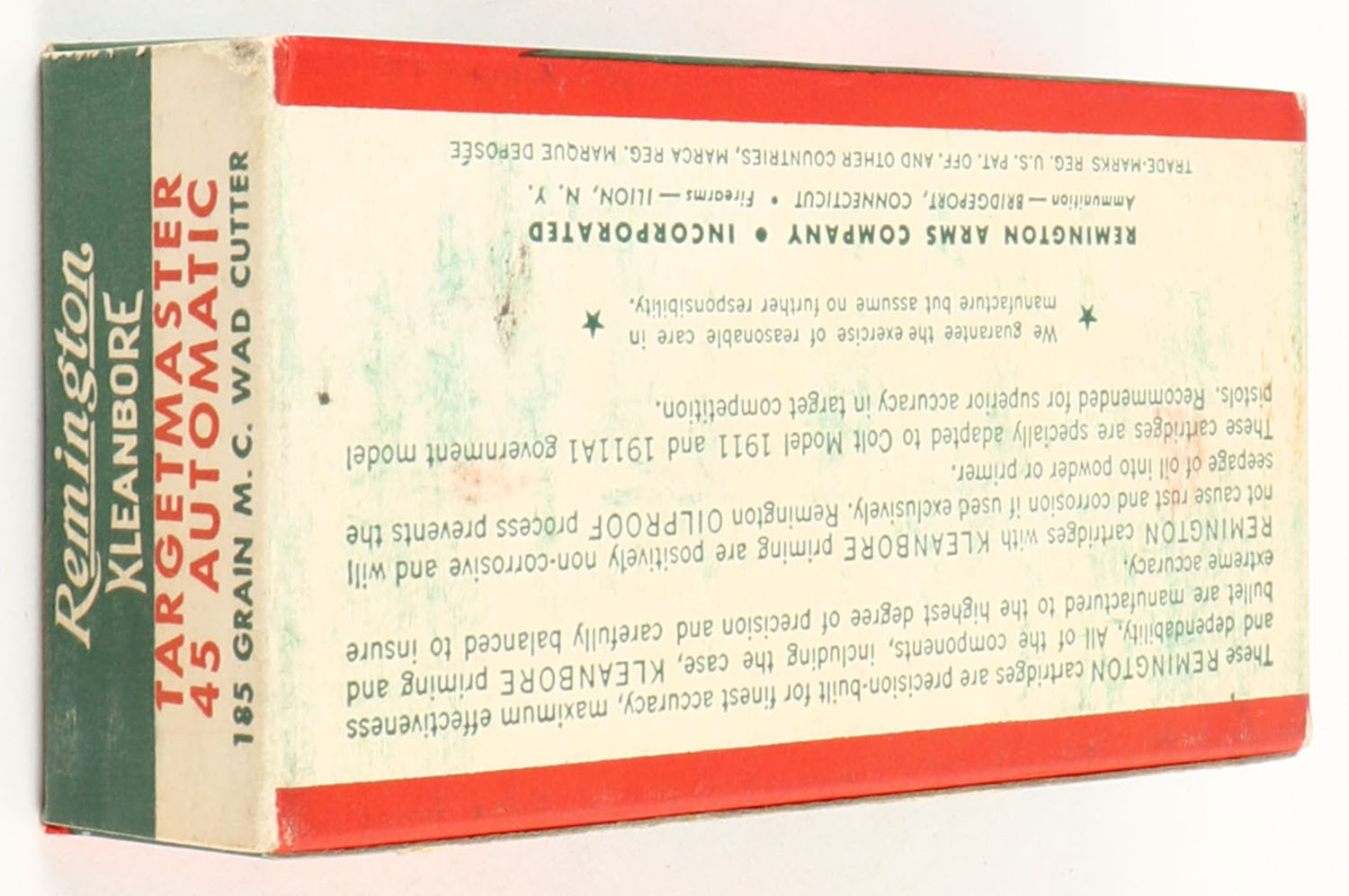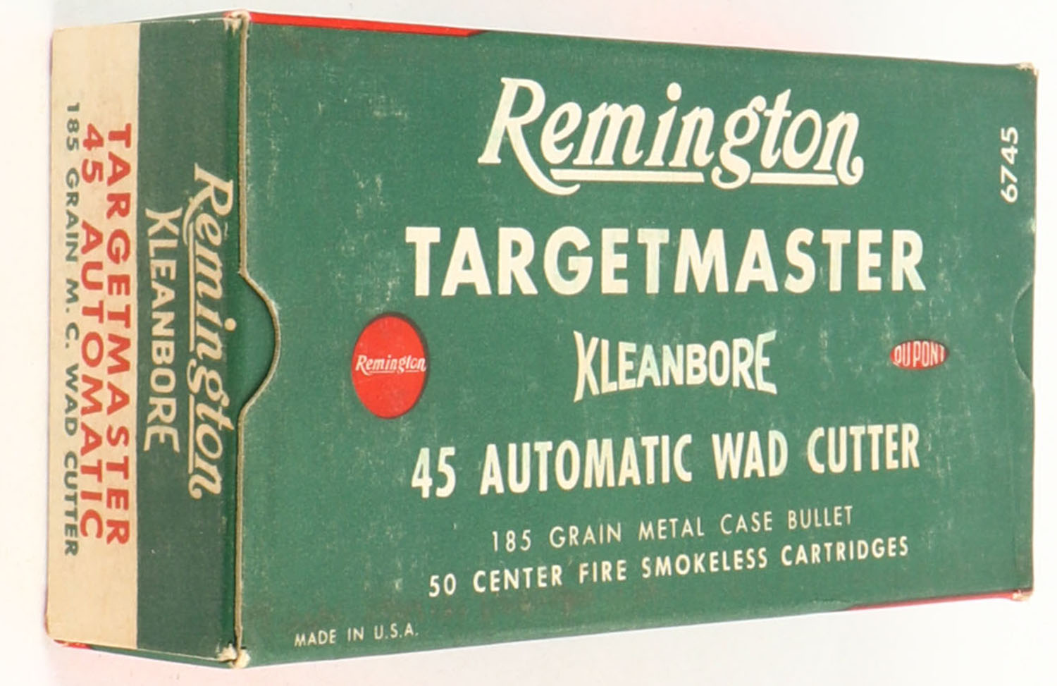 Remington, Targetmaster, .45 Automatic, 185 Grain Metal Case Wad Cutter, Full, 1pc. Green white & red box, box is solid with excellent color, very minor shelf & corner wear, edges are crisp, end flaps are solid, ammo is excellent to minty. Grade: Excellent ++ - Value: 16 to 60
