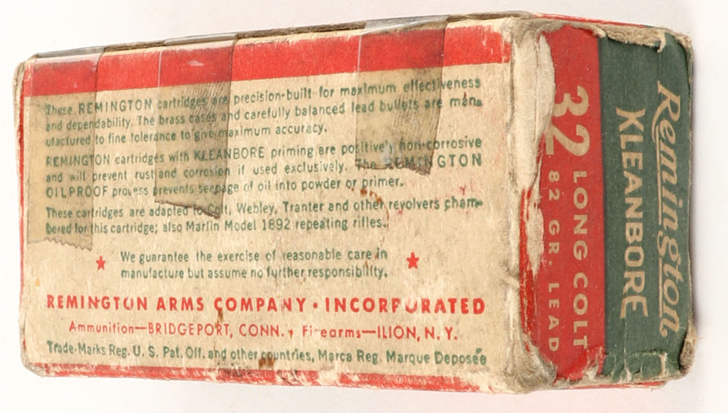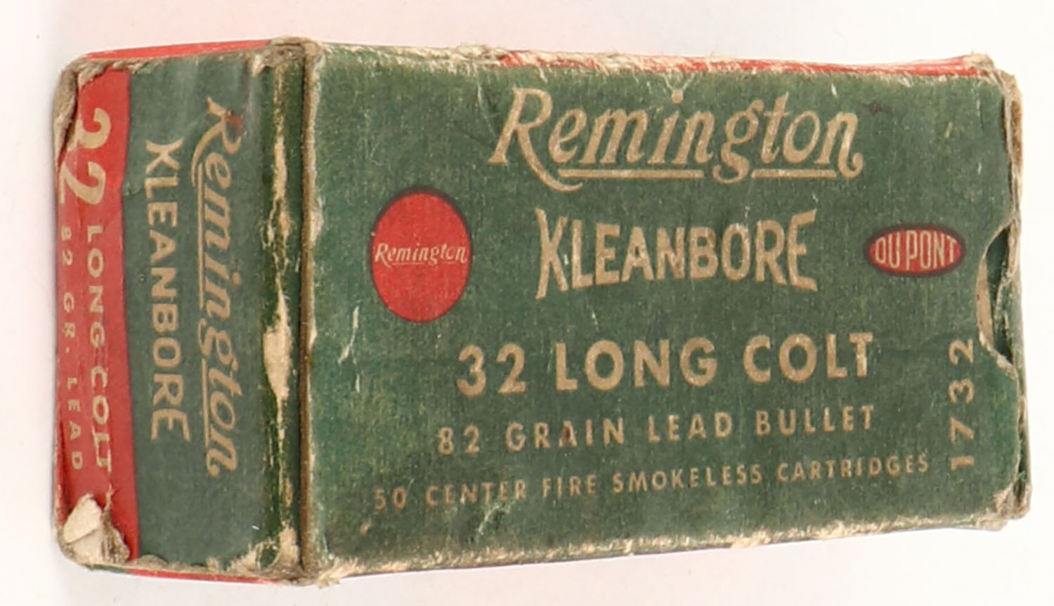 Remington, Kleanbore, .32 Long Colt, 82 Grain Lead Bullet, Full, 1pc. Green white & red box, box is solid with good color, age soiling, some shelf wear, edge & corner wear, tape on bottom, end flaps are solid, ammo is very good. Grade: Very Good + - Value: 30 to 90