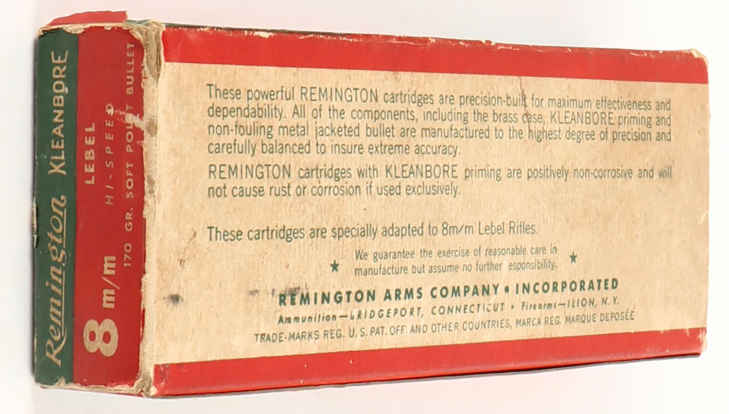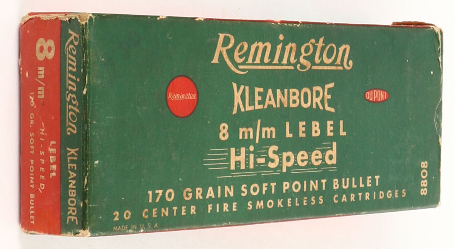 Remington, Kleanbore Hi-Speed, 8mm Lebel, 170 Grain Soft Point Bullet, Full, 1pc. Green white & red box, box is solid with very good color, minor age soiling & shelf wear, has corner wear with minor edge wear, end flaps are solid, ammo is very good. Grade: Very Good ++ - Value: 20 to 60