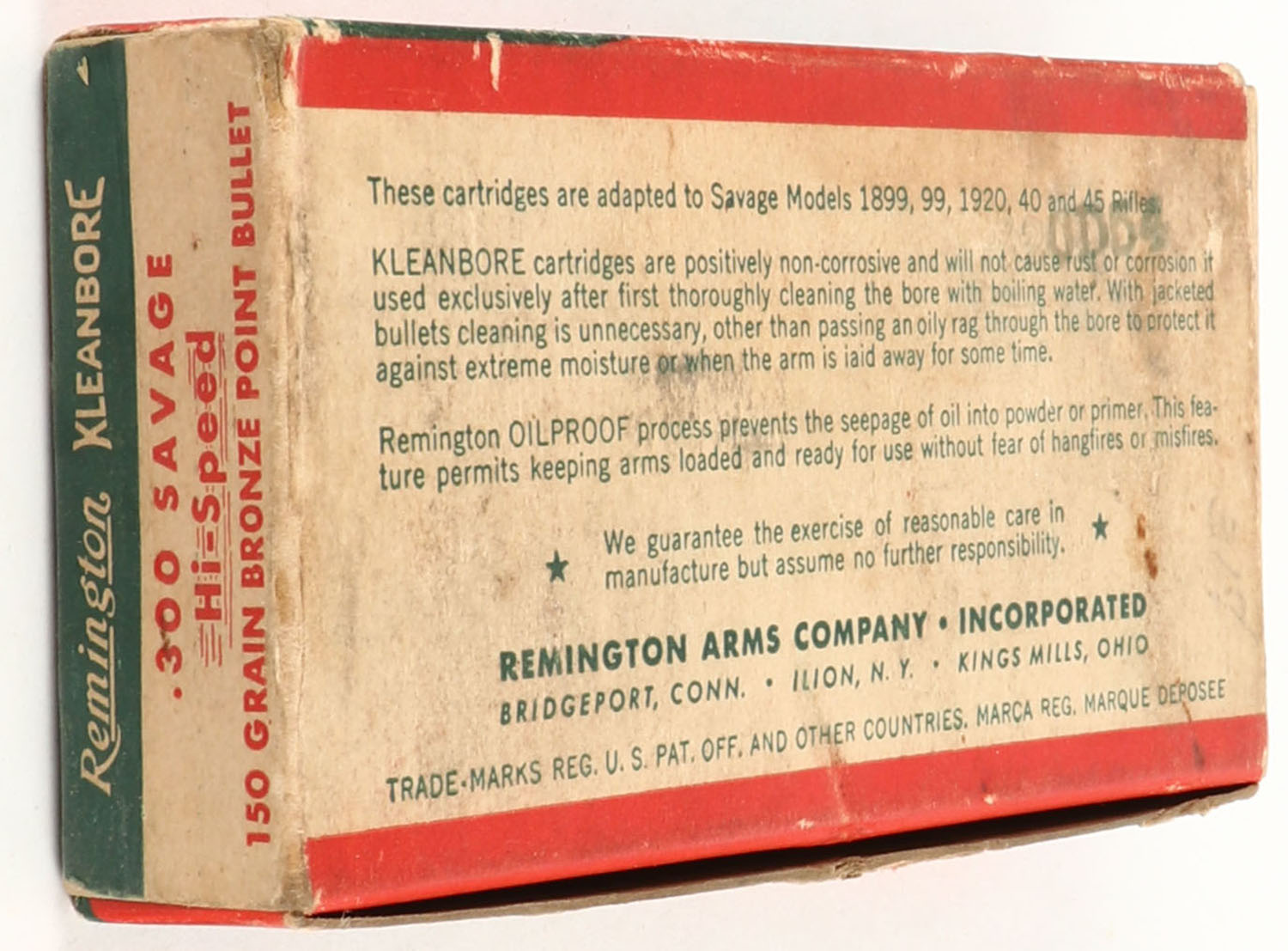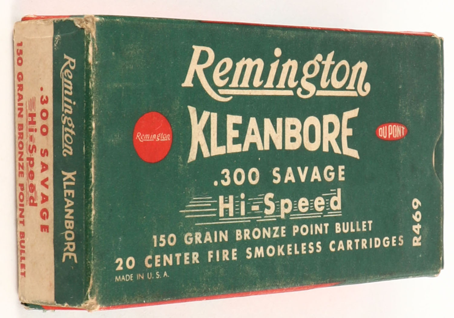 Remington, Kleanbore Hi-Speed, .300 Savage, Hi-Speed, 150 Gr. Bronze Point Bullet, 1pc, Full, green/red box with white print, box is solid, factory seam has unadhered, light age soiling, handling wear, light rub marks, & minor edge wear, ammo is good. Grade: Very Good ++ - Value: 30 to 90