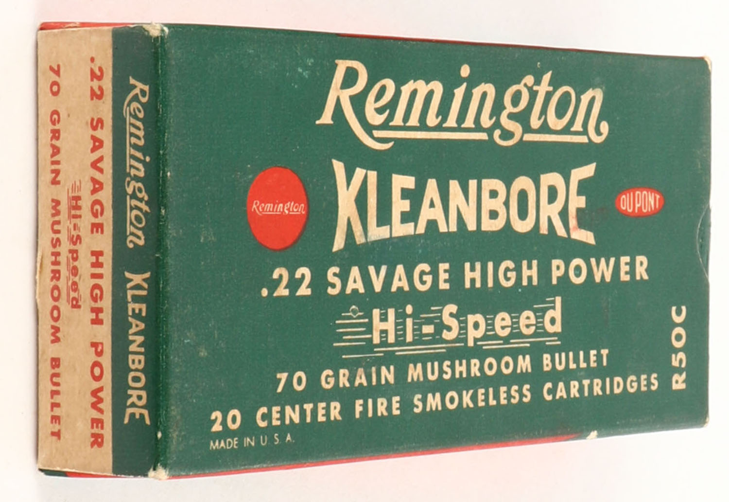 Remington, Kleanbore Hi-Speed, .22 Savage High Power, 70 Grain Mushroom Bullet, Full, 1pc. Green buff & red box, box is solid with very good to excellent color, minor age soiling & corner wear, edges are mostly crisp, end flaps are solid, ammo is very good to excellent. Grade: Excellent - Value: 20 to 60
