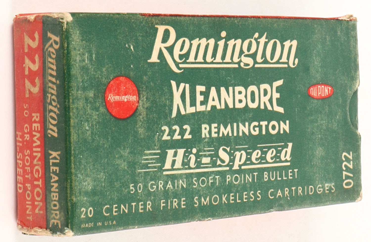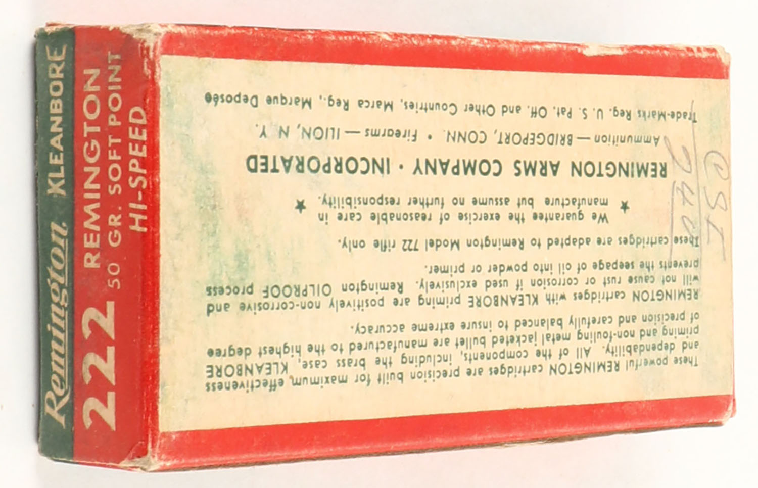 Remington, Kleanbore Hi-Speed, .222 Remington, 50 Grain Soft Point Bullet, Full, 1pc. Green white & red box, box is solid with excellent color, some shelf & corner wear, edges are crisp, end flaps are solid, ammo is excellent. Grade: Excellent - Value: 10 to 50
