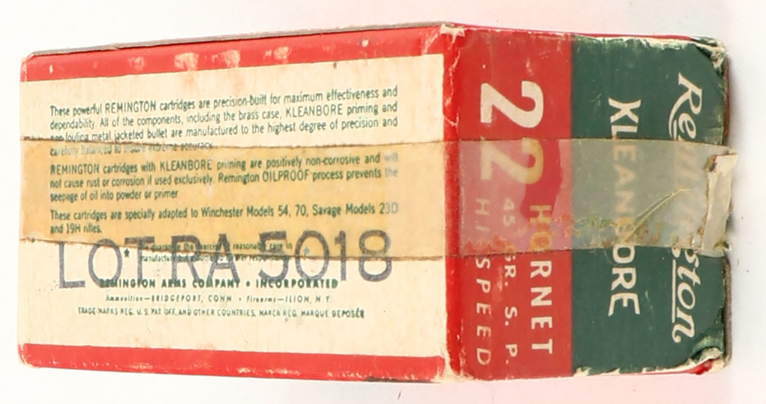 Remington, Kleanbore Hi-Speed, .22 Hornet, 45 Grain Soft Point Bullet, Full, 1pc. Green red & white box, box is solid with very good color, box is wrapped in tape, sticker residue on front, minor age soiling & edge wear, some corner wear, end flaps are solid, ammo is excellent. Grade: Very Good - Value: 30 to 90