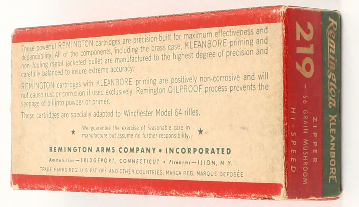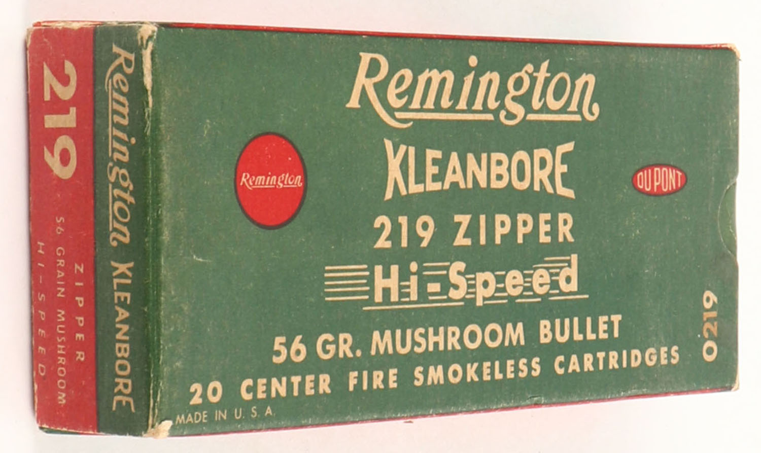Remington, Kleanbore Hi-Speed, .219 Zipper, 56 Grain Mushroom Bullet, Full, 1pc. Green white & red box, box is solid with very good color, minor age soiling & shelf wear, some corner wear, very minor edge wear, end flaps are solid, ammo is excellent to minty. Grade: Excellent - Value: 50 to 150