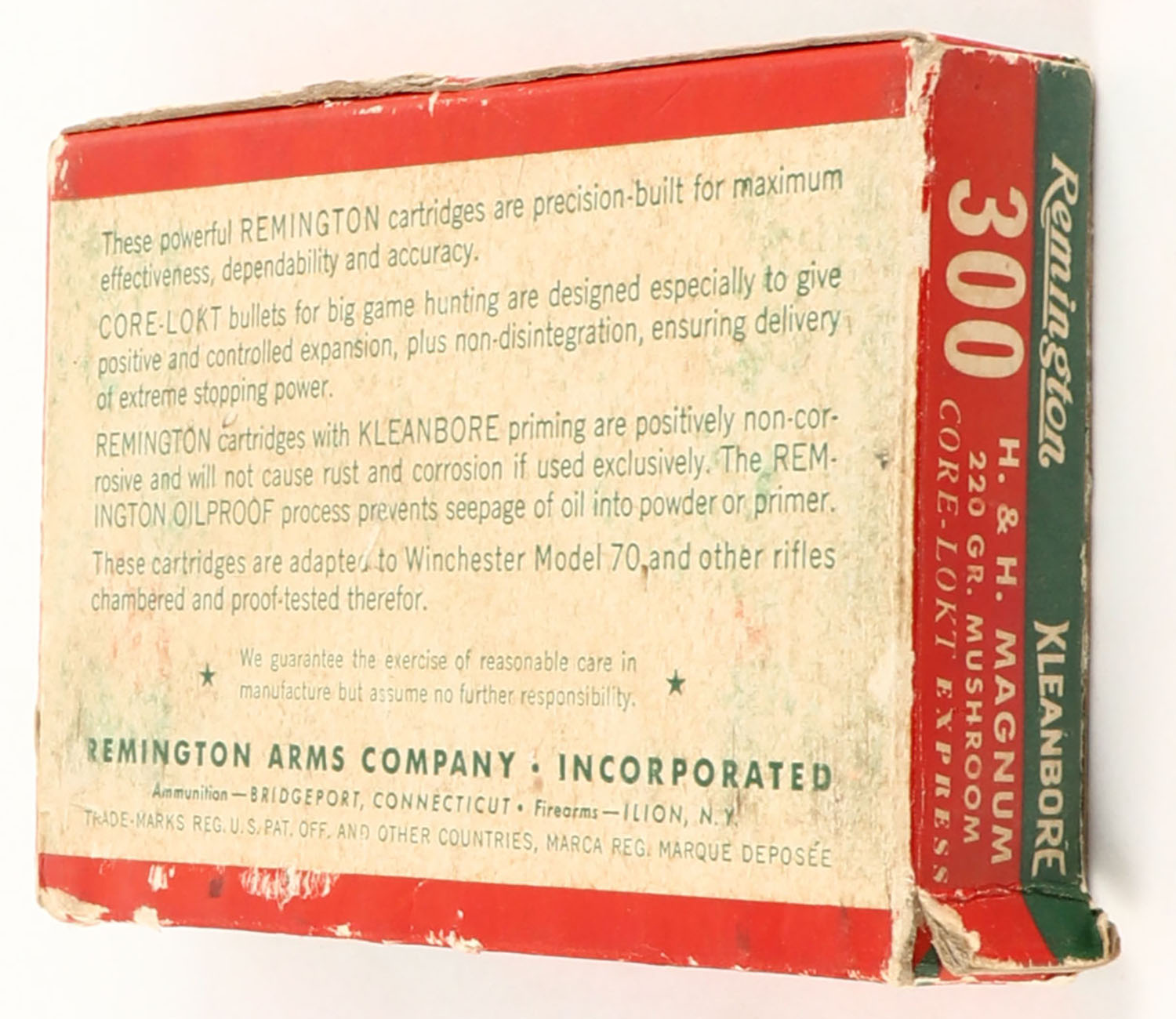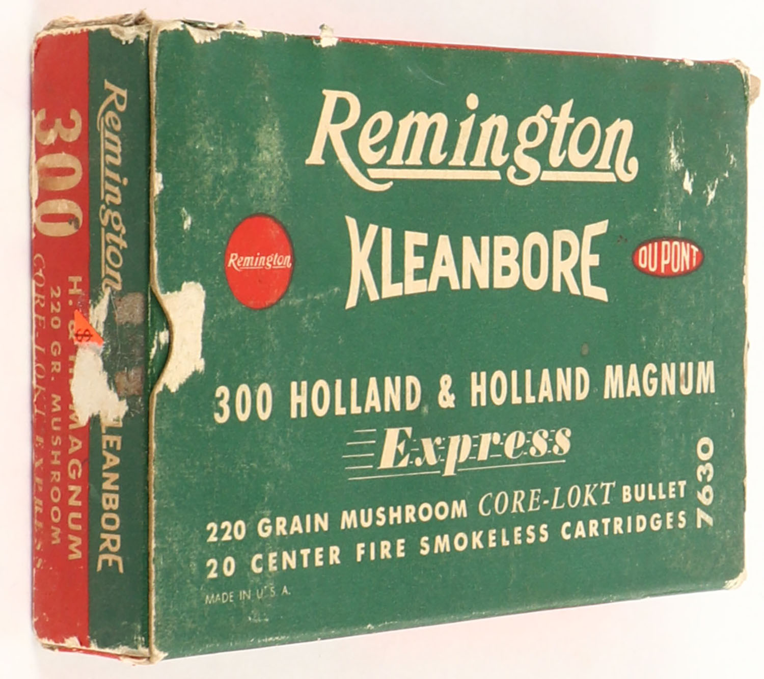 Remington, Kleanbore Express, .300 Holland & Holand Magnum, 220 Grain Core-Lokt Mushroom Bullet, Full, 1pc. Green white & red box, box is solid with excellent color, some shelf & corner wear, edges are mostly crisp, end flaps are solid, ammo is excellent. Grade: Very Good ++ - Value: 30 to 90