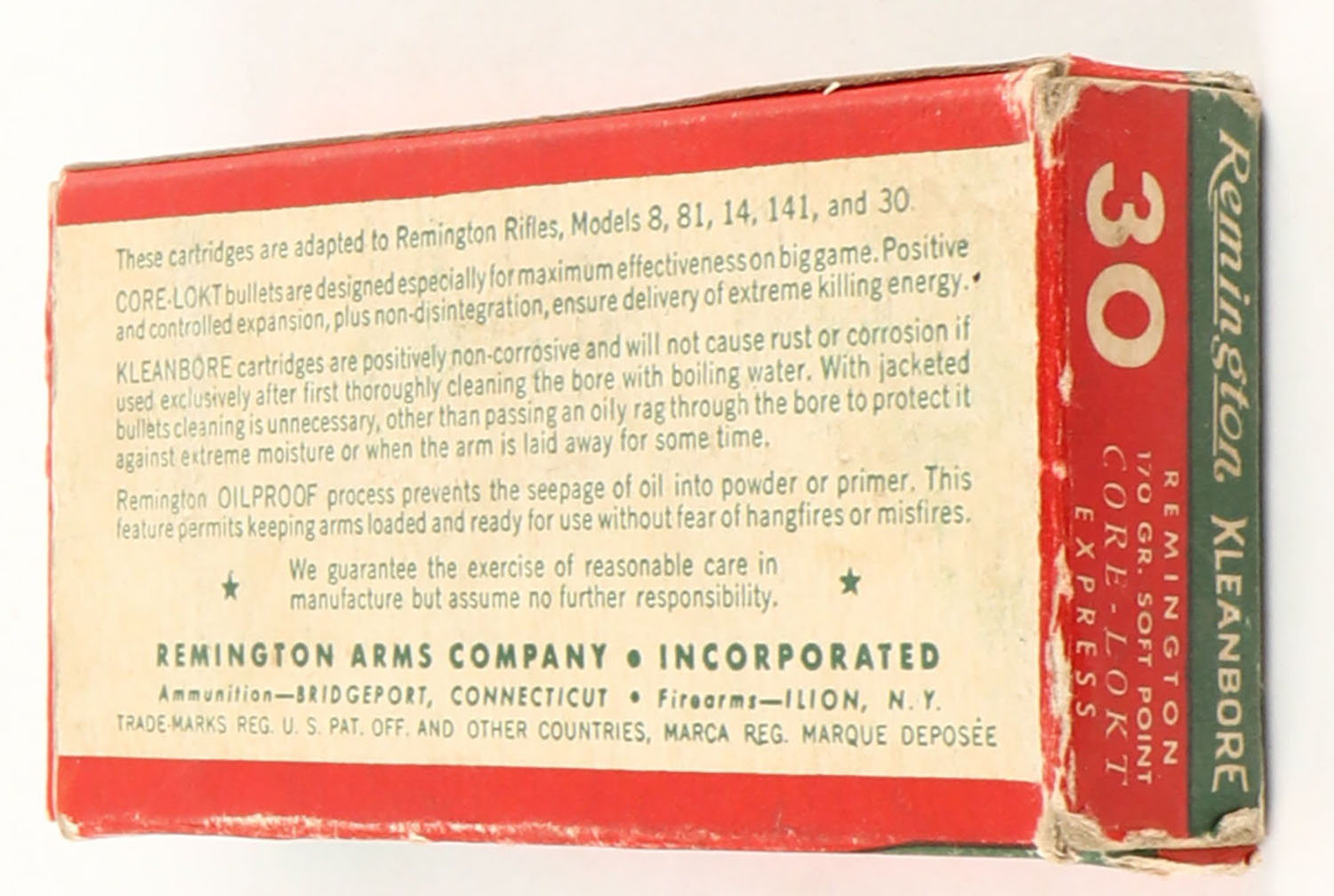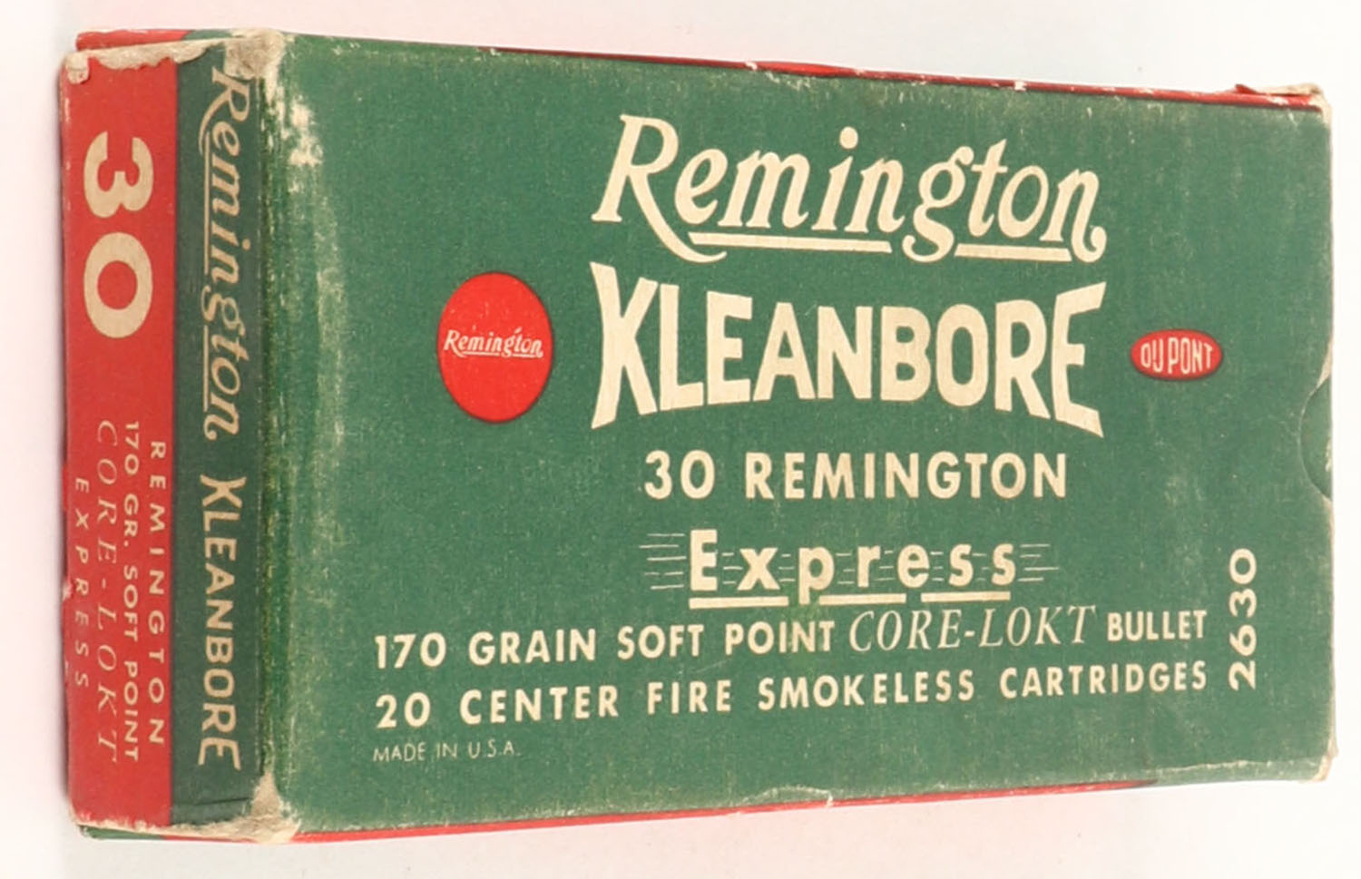 Remington, Kleanbore Express, .30 Remington, 170 Grain Soft Point Core-Lokt Bullet, Full, 1pc. Green white & red box, box is solid with excellent color, minor shelf wear, some corner wear, very minor edge wear, end flaps are solid, ammo is excellent. Grade: Excellent - Value: 40 to 120