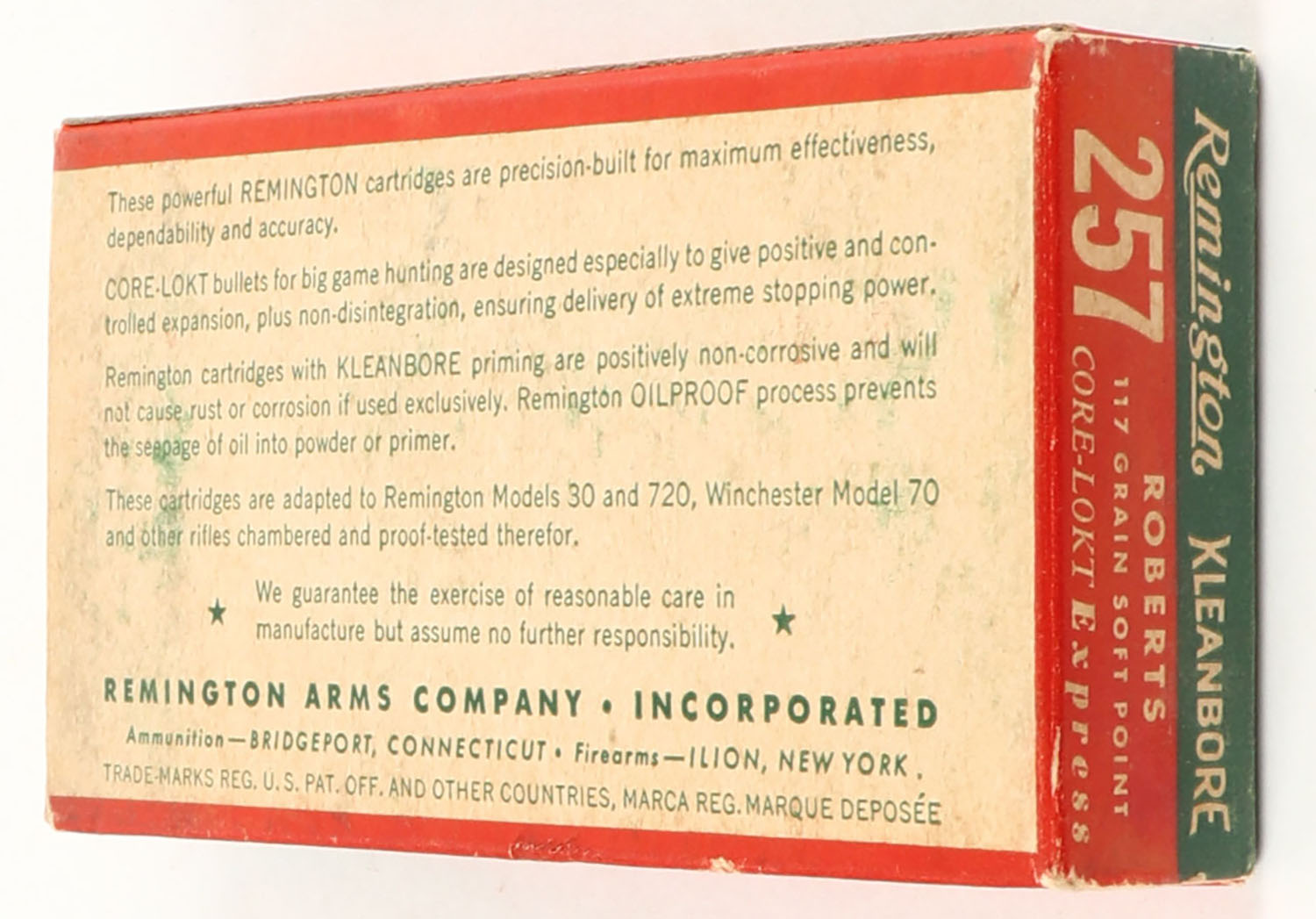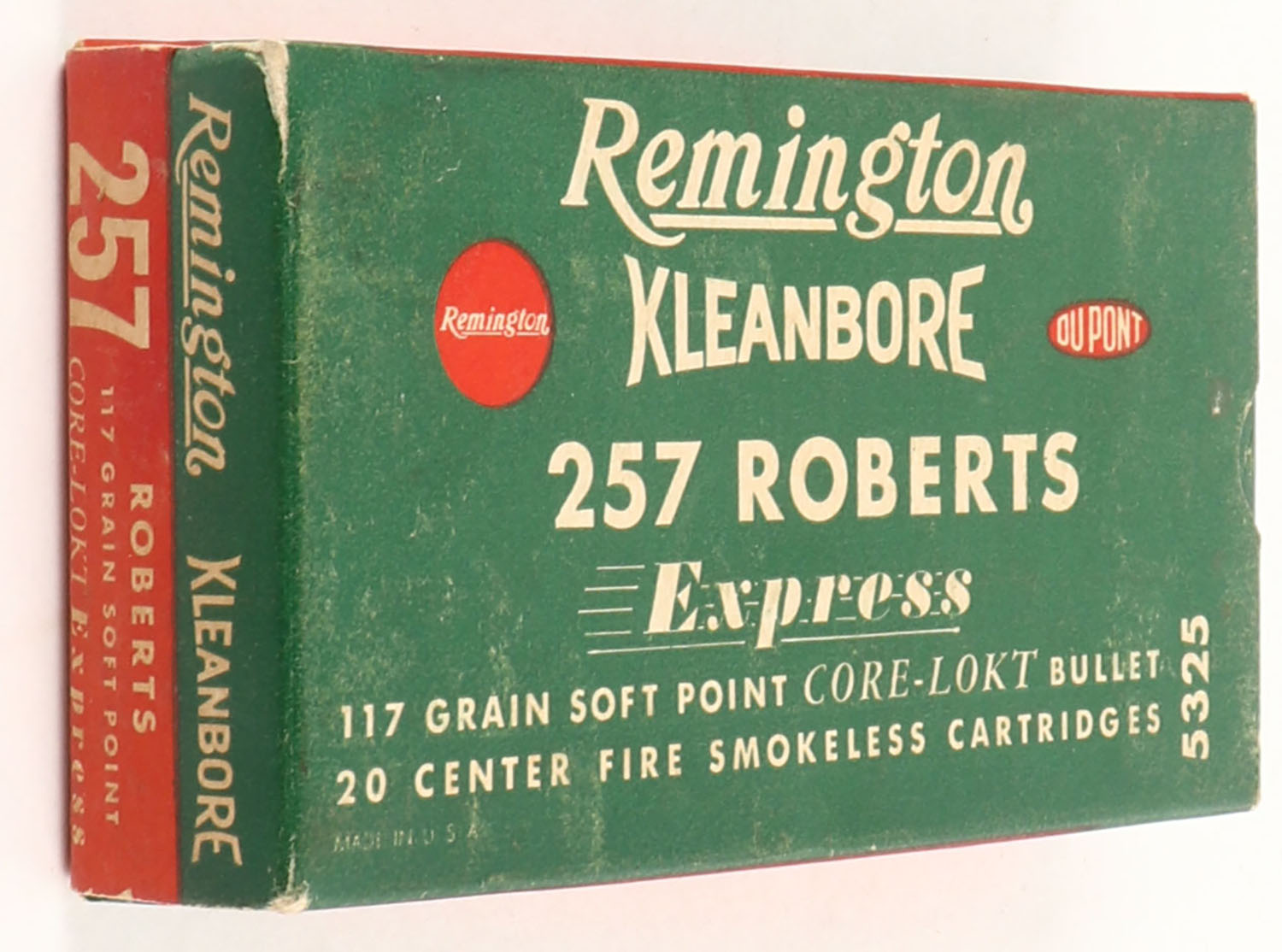 Remington, Kleanbore Express, .257 Roberts, 117 Grain Soft Point Core-Lokt Bullet, Full, 1pc. Green white & red box, box is solid with excellent color, minor shelf & corner wear, edges are crisp, end flaps are solid, ammo is excellent. Grade: Excellent + - Value: 30 to 90