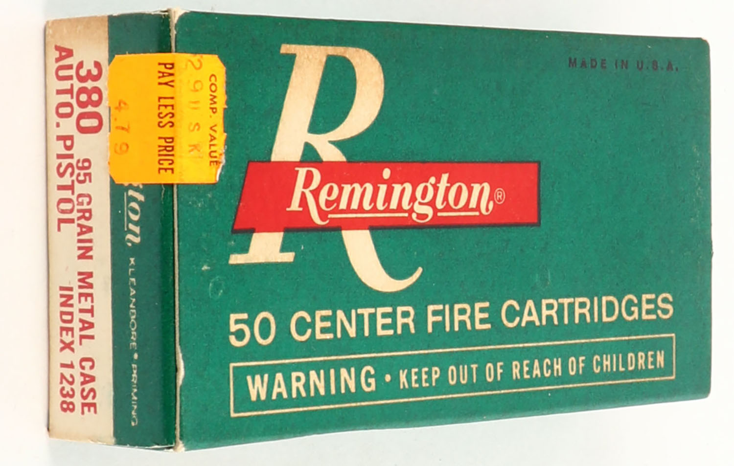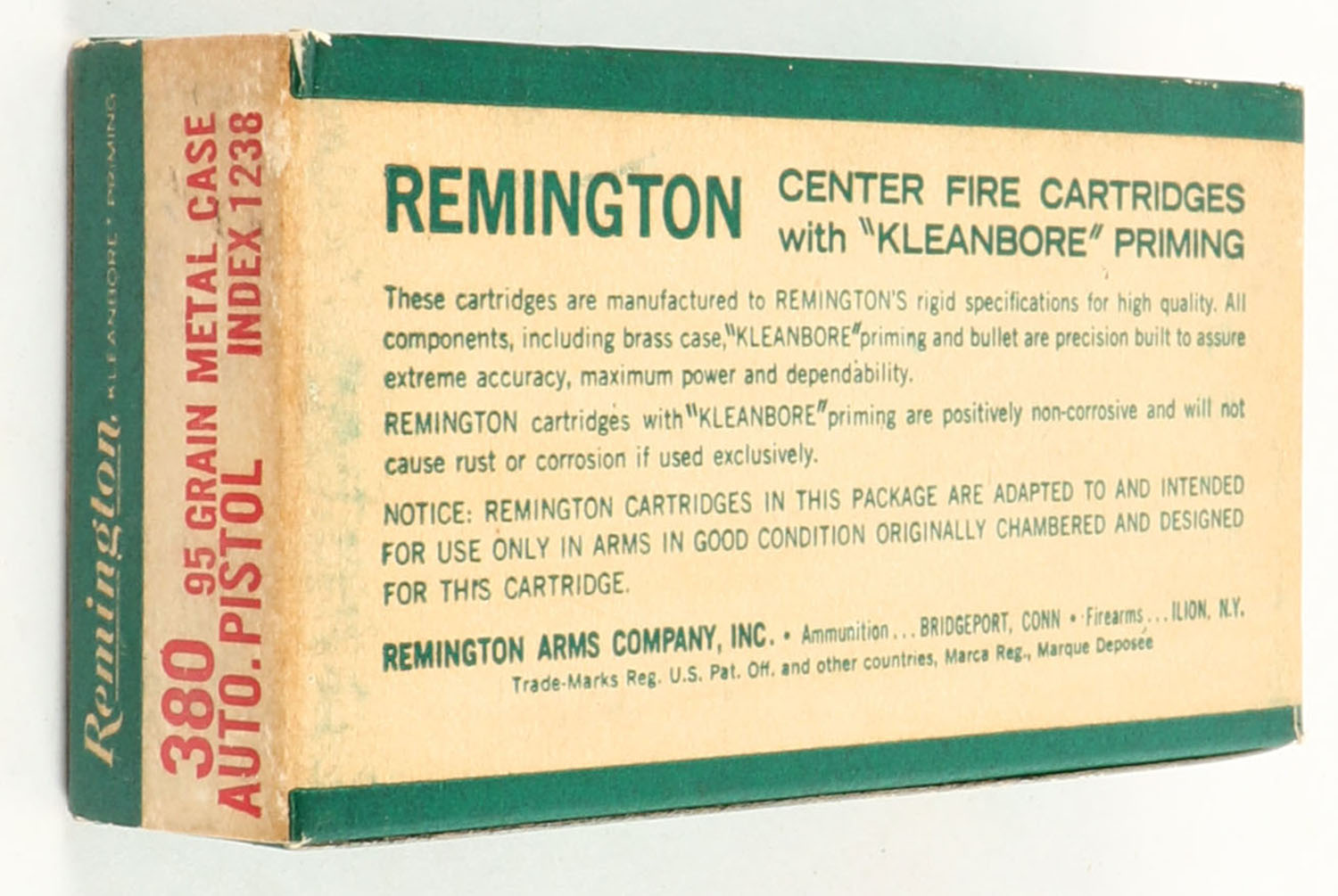 Remington, Center Fire Cartridges, .380 Auto. Pistol, 95 Grain Metal Case, Full, 1pc. Green white & red box, box is very solid with excellent color, ammo is excellent. Grade: Excellent + - Value: 14 to 40