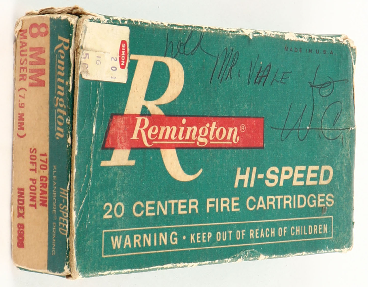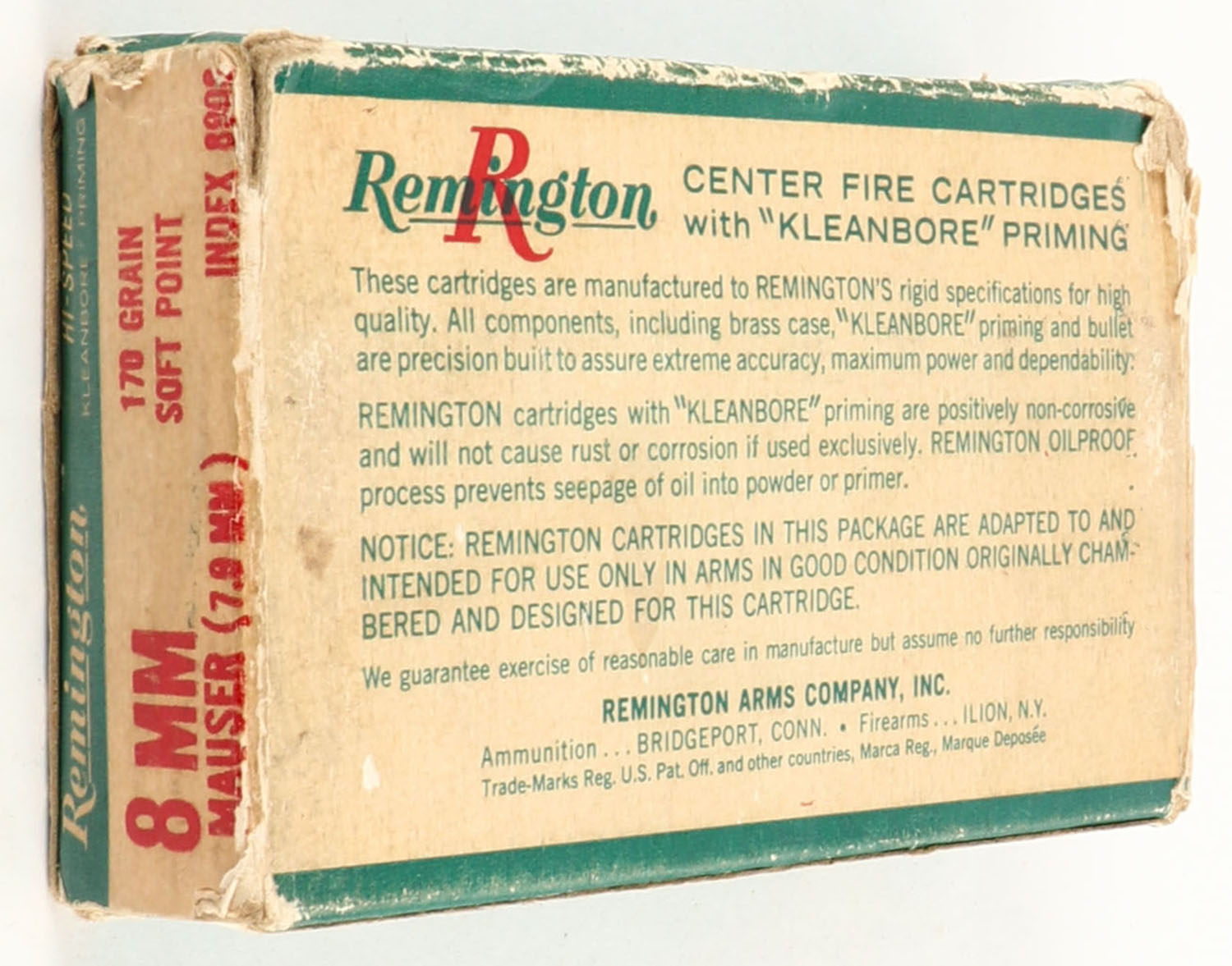 Remington, 8mm Mauser, 170 Gr. Soft point, 1pc, Full, green & white box with red/white print, box has age soiling with edge wear & writing to box, ammo is very good. Grade: Very Good - Value: 20 to 40