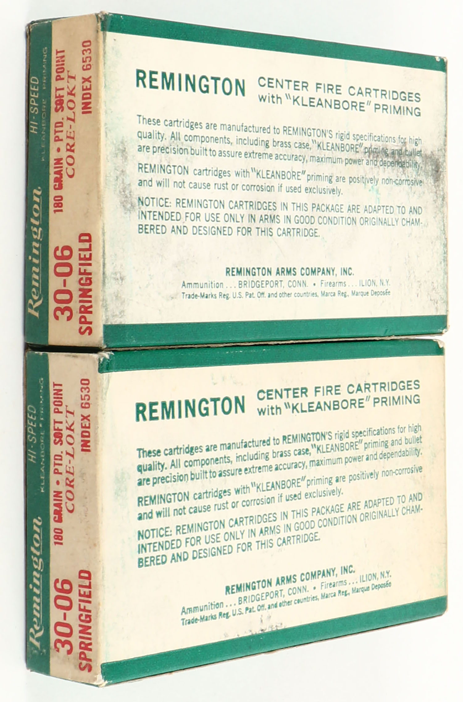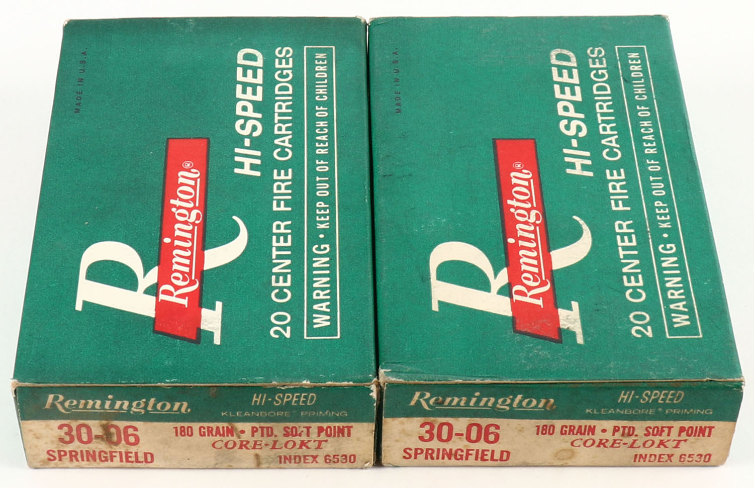 Remington, Lot of (2), High Speed, .30-06 Springfield, 180 Grain Core-Lokt Pointed Soft Point, Full, 1pc. Green. White box with red/white print, boxes are solid with excellent color, end flaps are solid, ammo is excellent. Grade: Excellent ++ - Value: 30 to 60