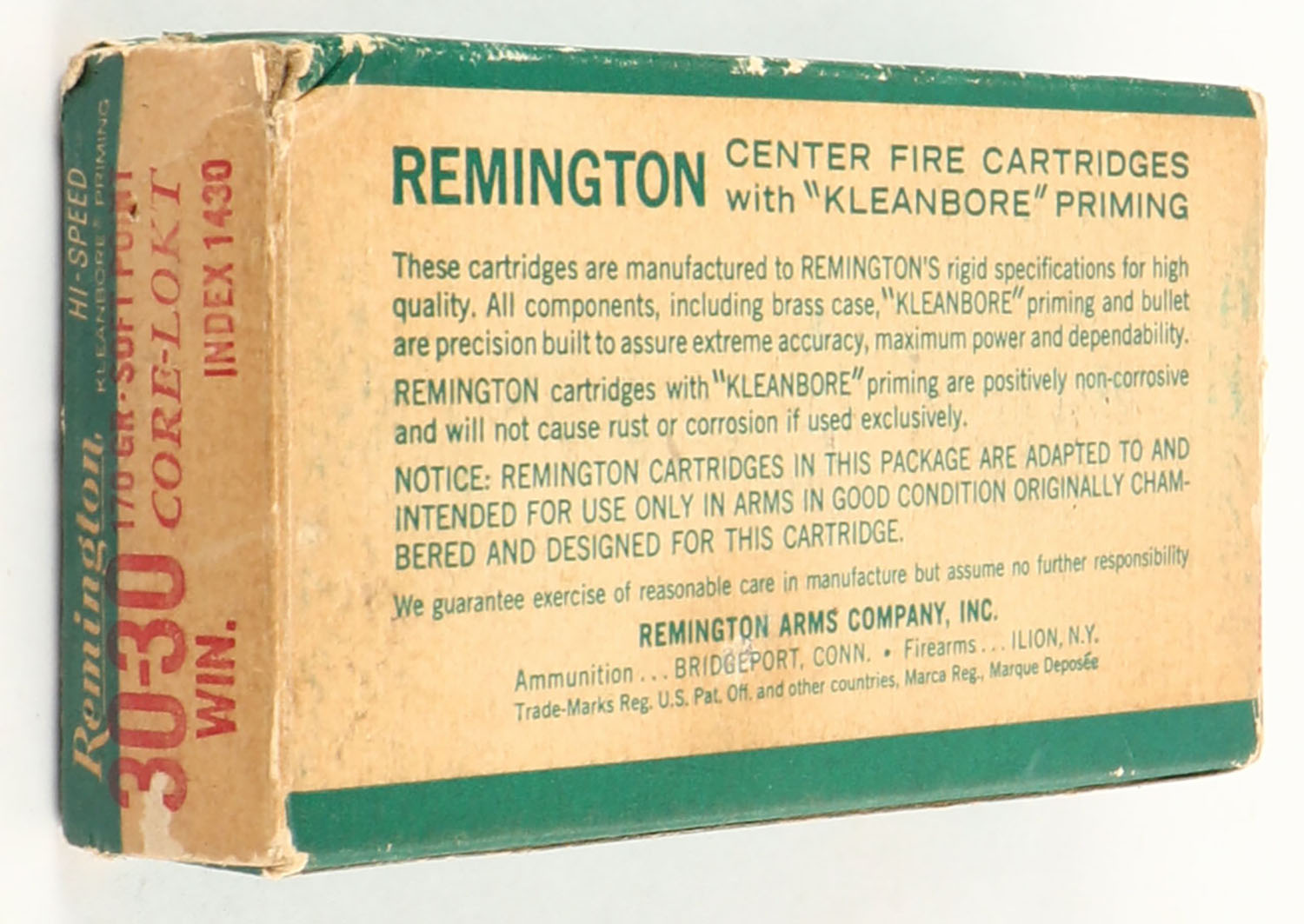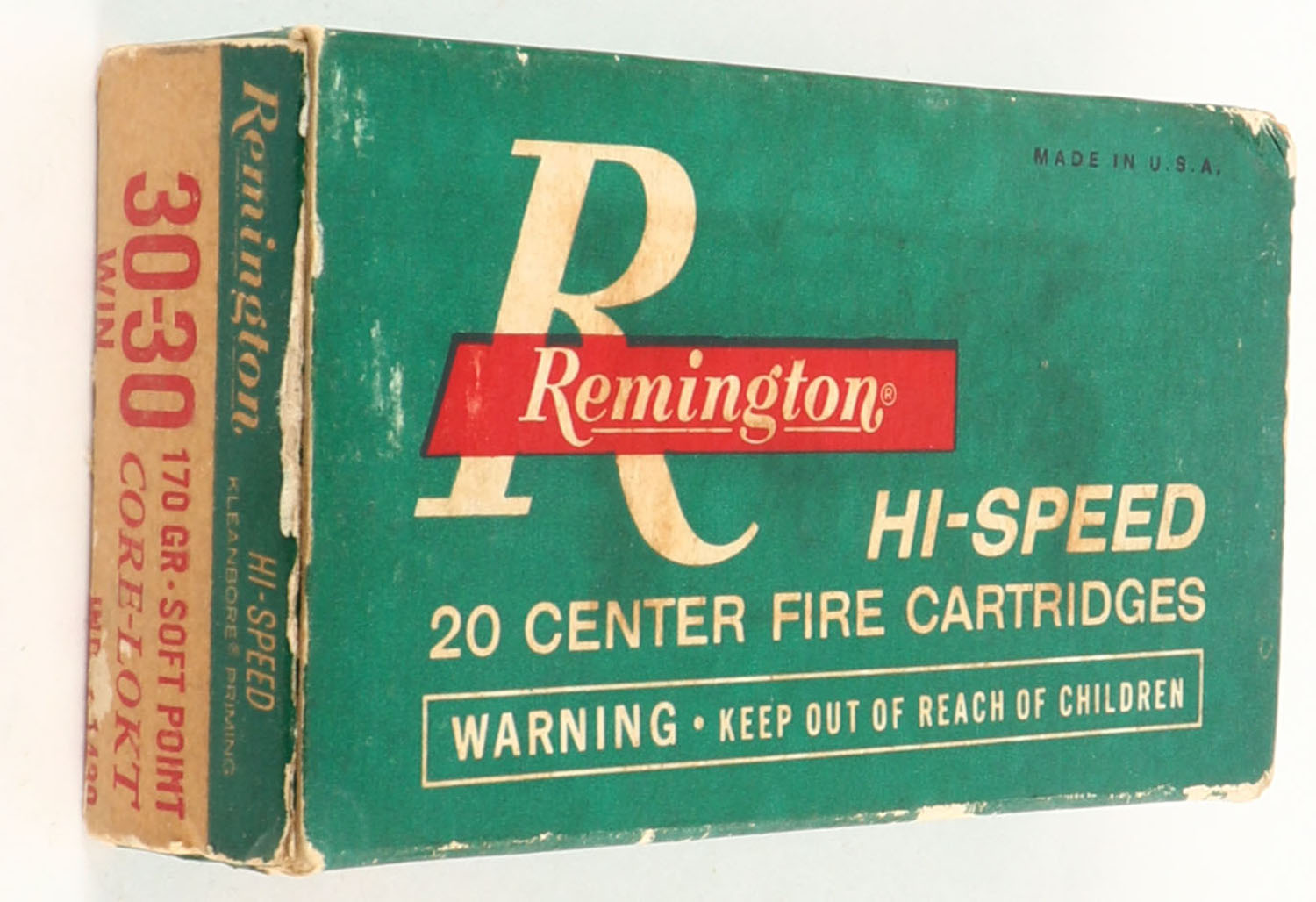 Remington, Hi-Speed, .30-30 Winchester, 170 Grain Soft Point Core-Lokt, Partial 18rds, 1pc. Green white & red box, box has some age soiling & corner wear, ammo is very good. Grade: Very Good - Value: 10 to 40