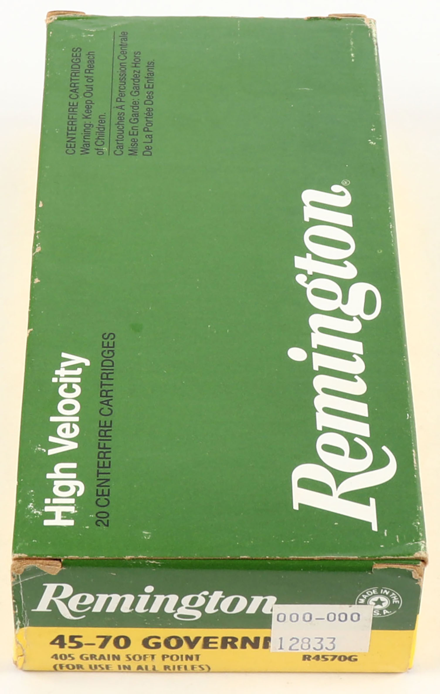 Remington, High Velocity, .45-70 Government, 405 Gr. Soft Point, 1pc, Full, green/yellow box with white/black print, box is solid with light rub wear & handling wear, ammo is excellent. Grade: Very Good ++ - Value: 30 to 60