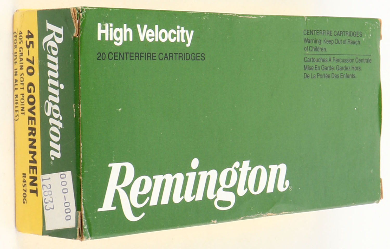 Remington, High Velocity, .45-70 Government, 405 Gr. Soft Point, 1pc, Full, green/yellow box with white/black print, box is solid with very minor edge wear, ammo is excellent. Grade: Very Good ++ - Value: 30 to 60