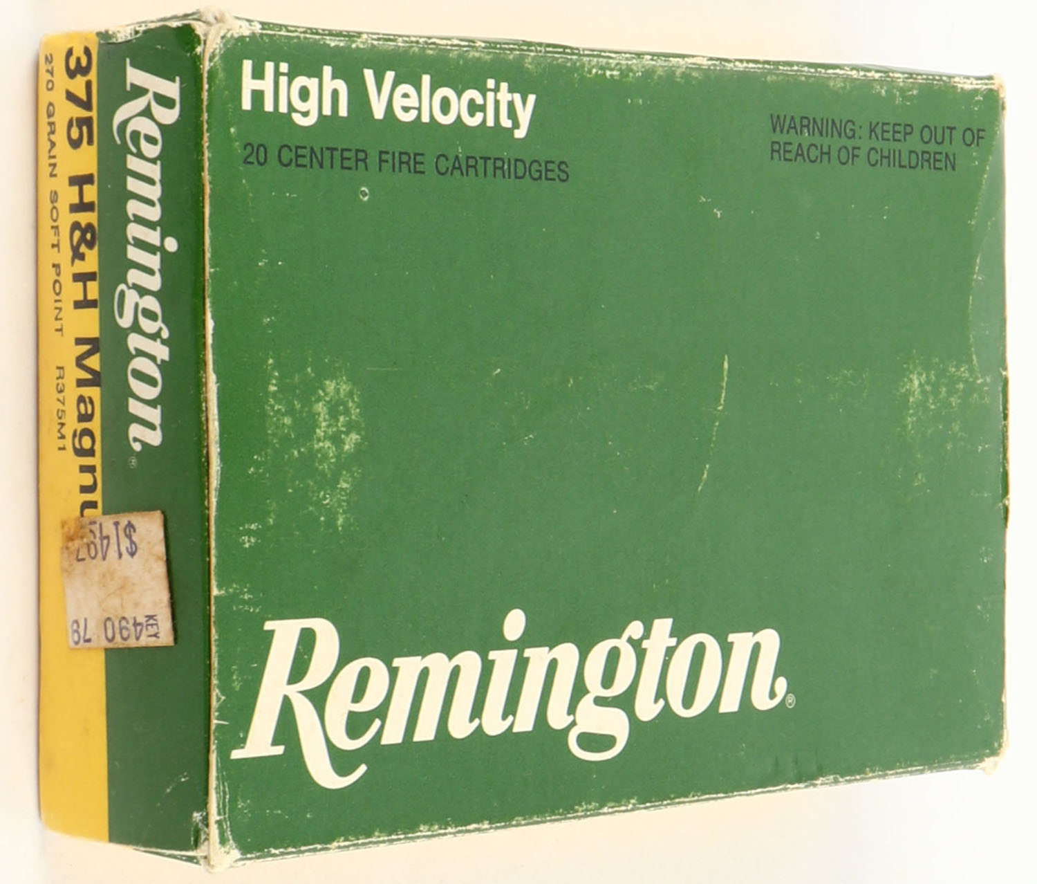 Remington, High Velocity, 375 H&H Magnum, 270 Gr. Soft Point, Partial 19rds, 1pc. Green & yellow box, box has edge wear with light scuffing, ammo is very good. Grade: Very Good - Value: 20 to 60