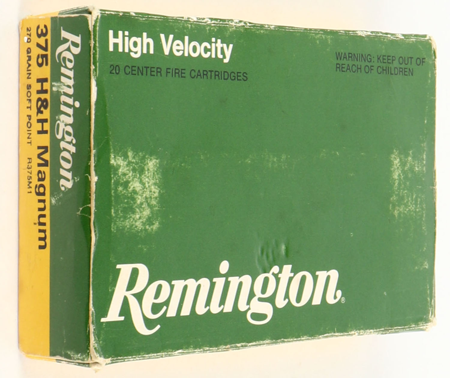 Remington, High Velocity, 375 H&H Magnum, 270 Gr. Soft Point, Full, 1pc. Green & yellow box, box has light scuffing with edge wear, ammo is very good. Grade: Very Good ++ - Value: 20 to 60
