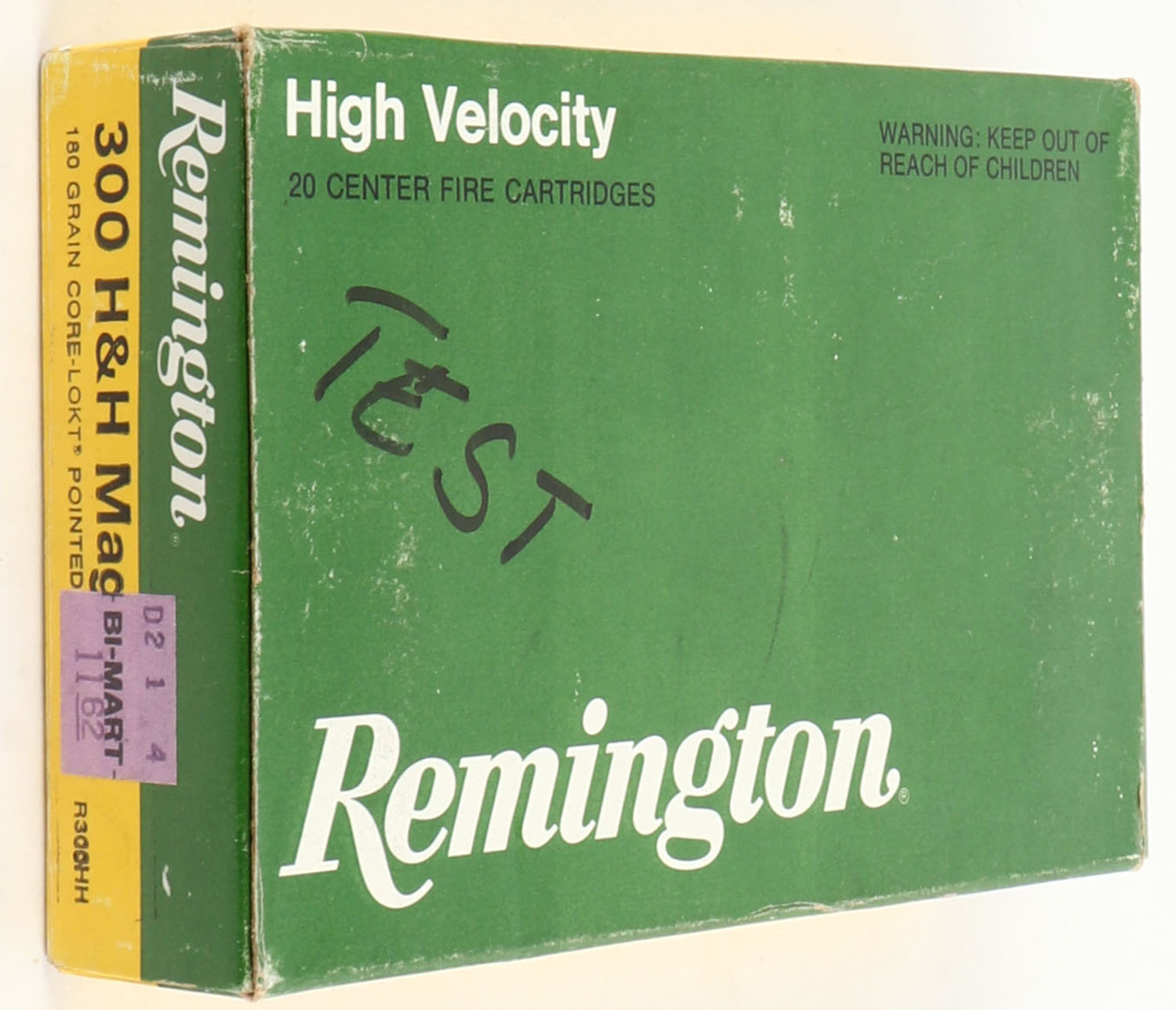 Remington, High Velocity, 300 H&H Magnum, 180 Gr. Core-Lokt Pointed Soft Point, 1pc, Full, Green & yellow box with white & black print, box has shelf wear with writing to top, ammo is excellent. Grade: Excellent - Value: 40 to 120
