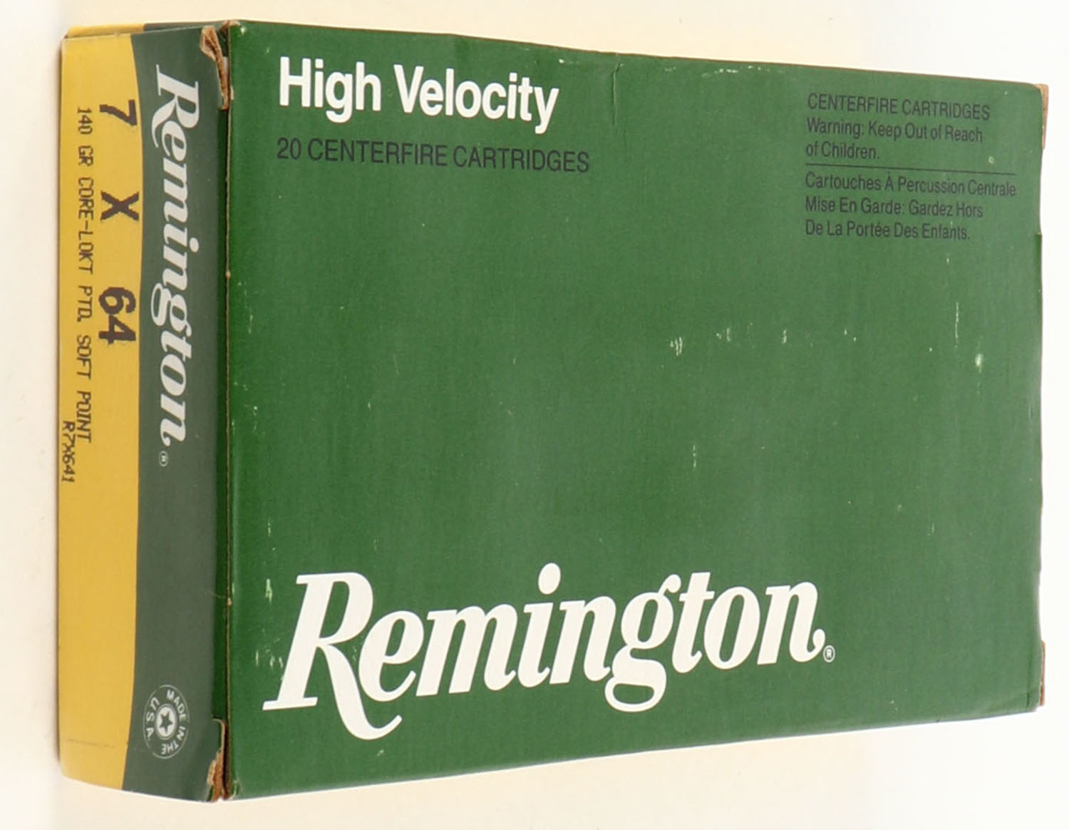 Remington, High Velocity, 7 x 64, 140 Gr. Core-Lokt Ptd. Soft Point, Full, 1pc. Green, yellow & white box, box is very solid with excellent color, end flaps are solid, ammo is excellent. Grade: Excellent + - Value: 16 to 60