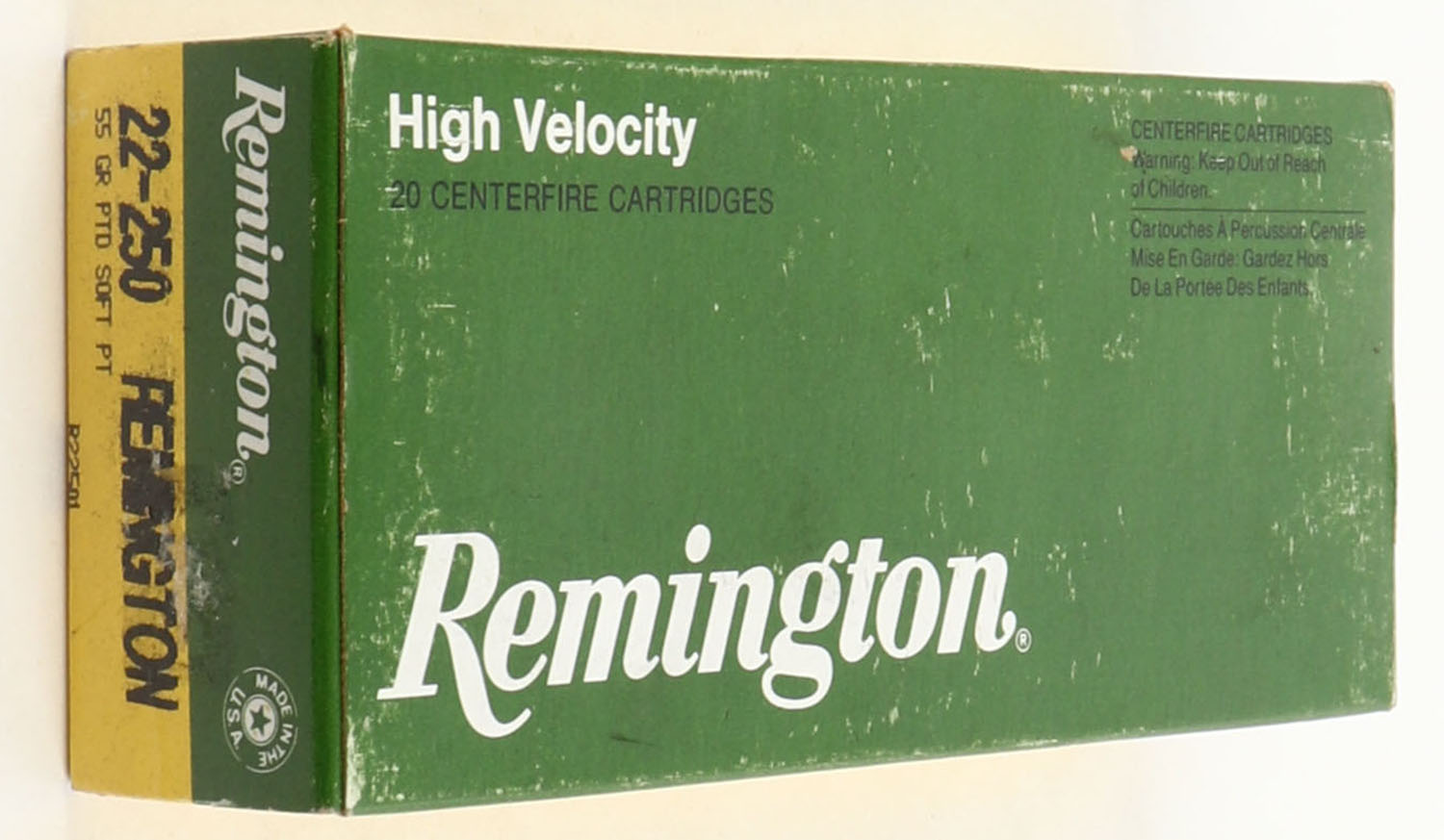 Remington, High Velocity, 22-250 Remington, 55 Gr. PTD Soft PT, Full, 1pc. Yellow, green, white & black box, box is very solid with some rub marks, end flaps are solid, ammo is excellent. Grade: Excellent - Value: 16 to 60