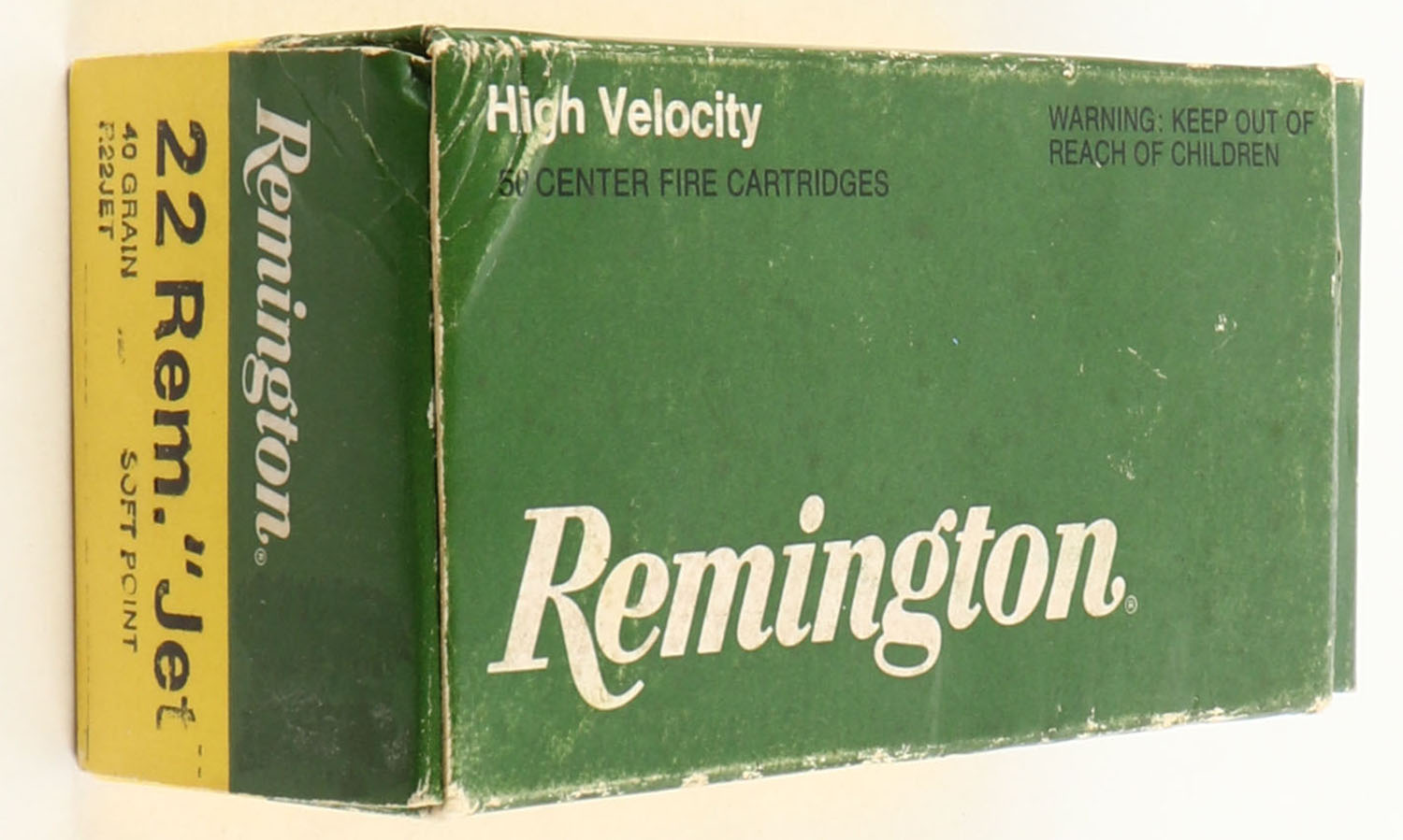 Remington, High Velocity, 22 Rem. ''Jet'' 40 Grain Soft Point, Full, 1pc. Green & yellow box, box is solid with good color, end flaps are solid, box has rub marks edge & corner wear, ammo is excellent. Grade: Very Good + - Value: 50 to 150