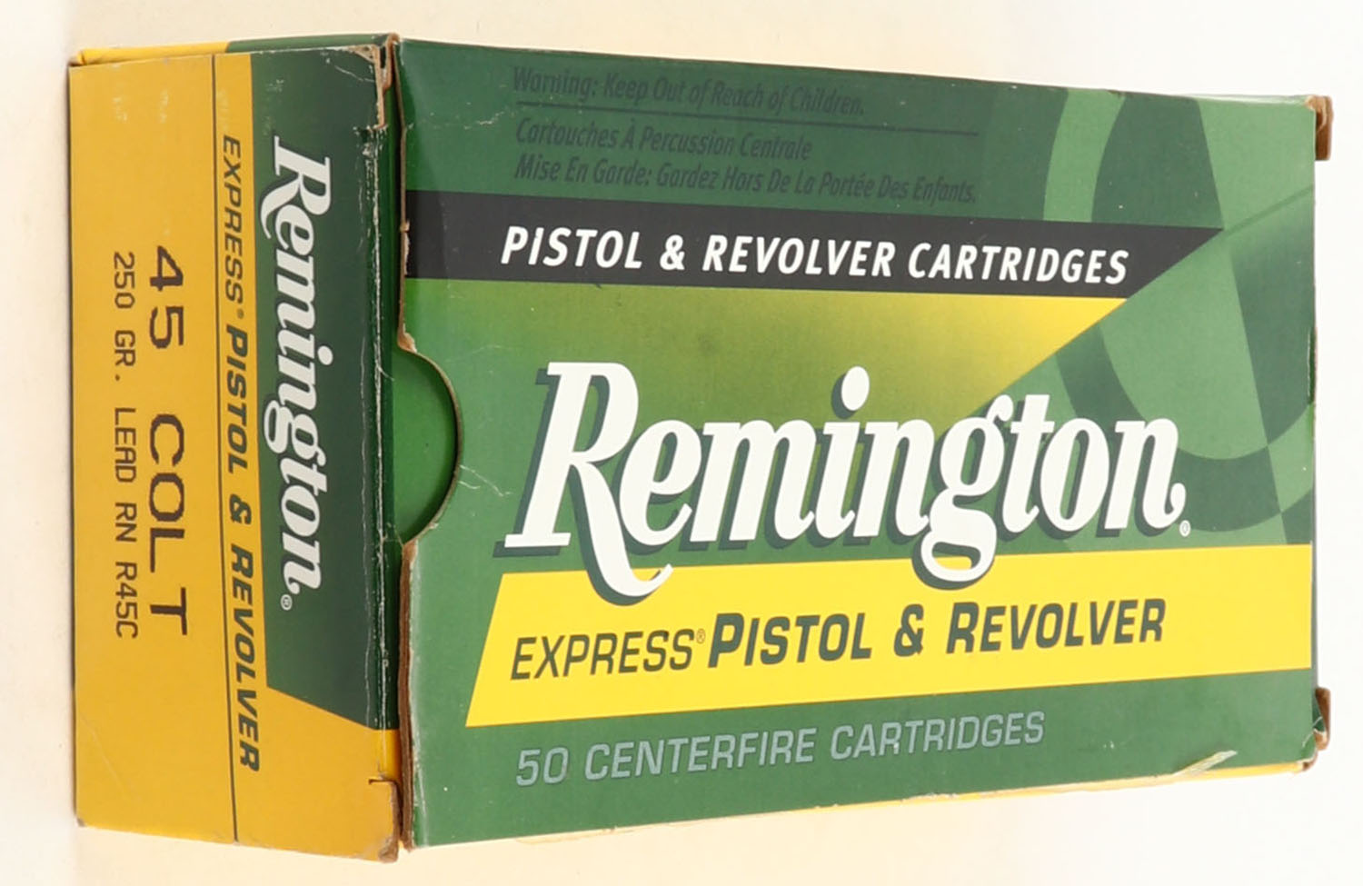 Remington, Express, 45 Colt, 250 Grain Lead Round Nose, Full, 1pc. Multi-colored box, box is very solid with great color, end flaps are solid, ammo is minty. Grade: Excellent ++ - Value: 30 to 90