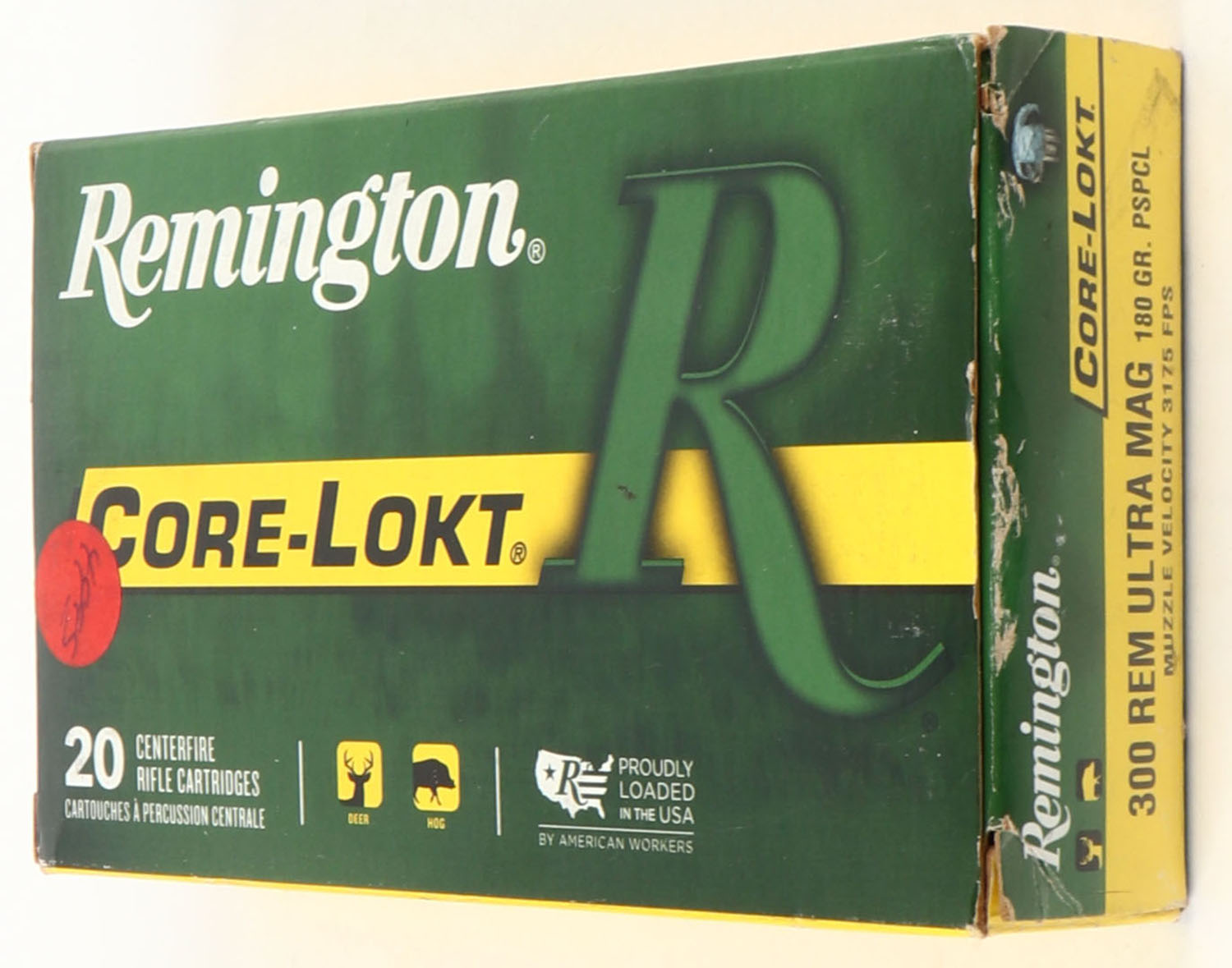 Remington, Core-Lokt, 300 Rem Ultra Mag, 180 Grain PSPCL, Partial 17rds, 1pc. Multi-colored box, box is very solid with great color, has very minor corner wear, end flaps are solid, ammo is excellent. Grade: Excellent - Value: 20 to 60