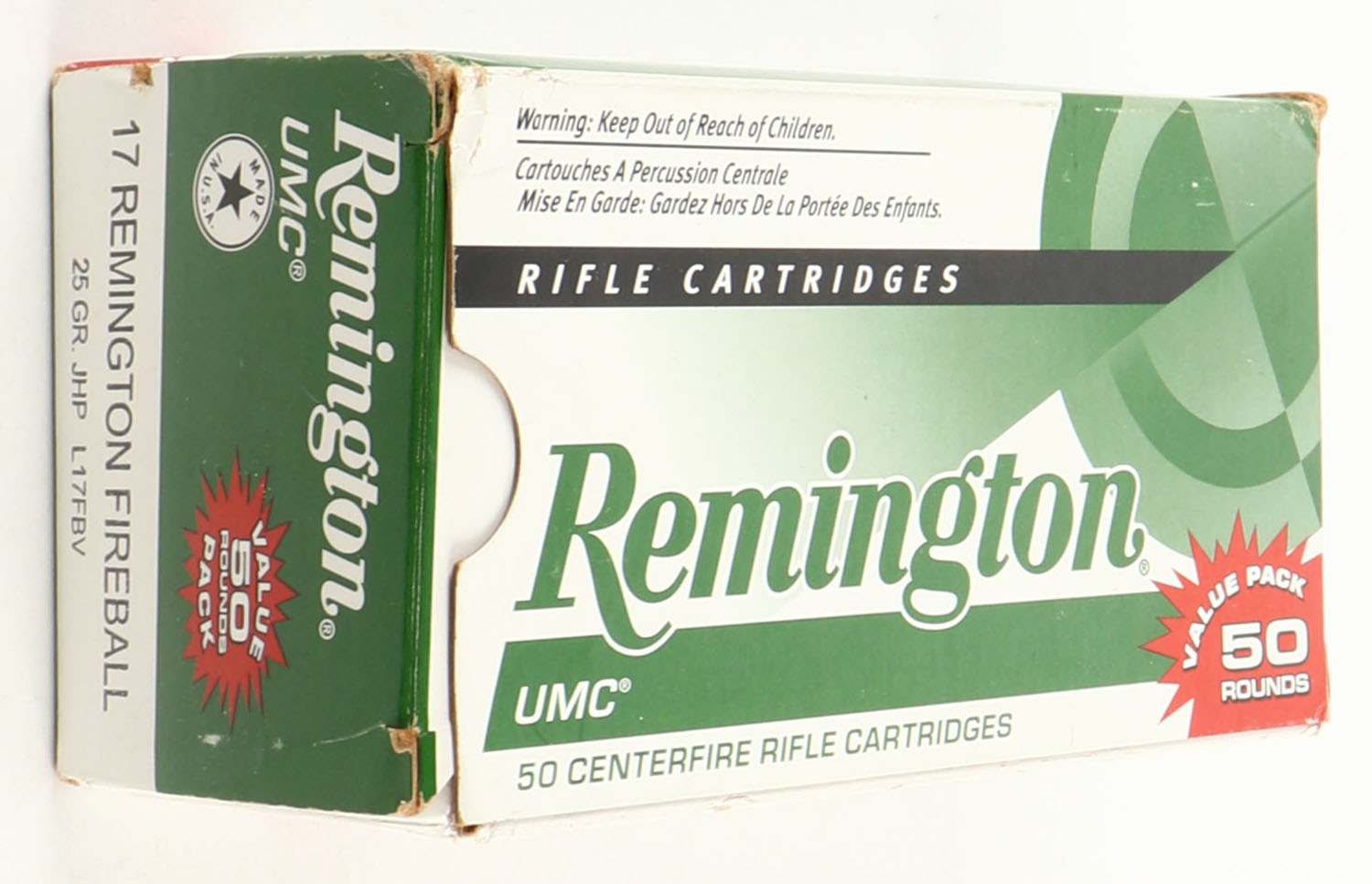 Remington, .17 Remington Fireball, 25 Grain, JHP, Full, 1pc. Green & white box, box is solid with great color, ammo is excellent. Grade: Excellent - Value: 20 to 60