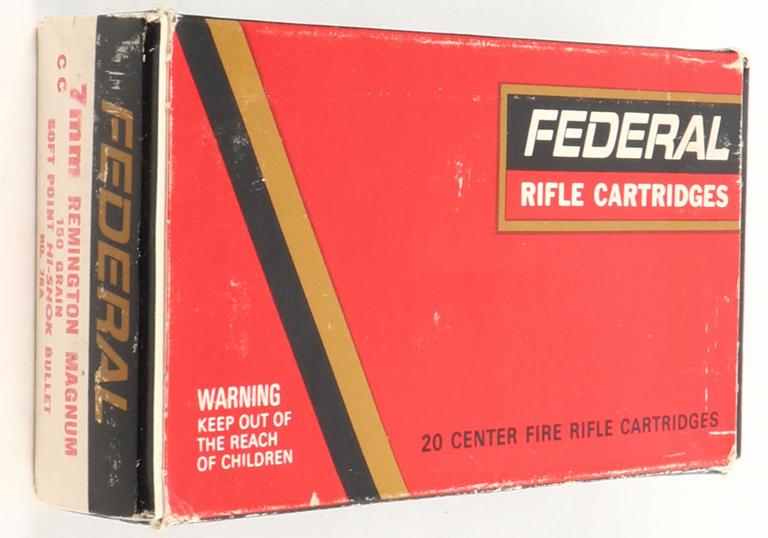Federal, 7mm Remington Magnum, 150 Grain Soft Point Hi-Shok Bullet, 1pc, Partial 19rds, box has light scuffing, end flaps are solid, ammo is very good. Grade: Excellent + - Value: 20 to 60