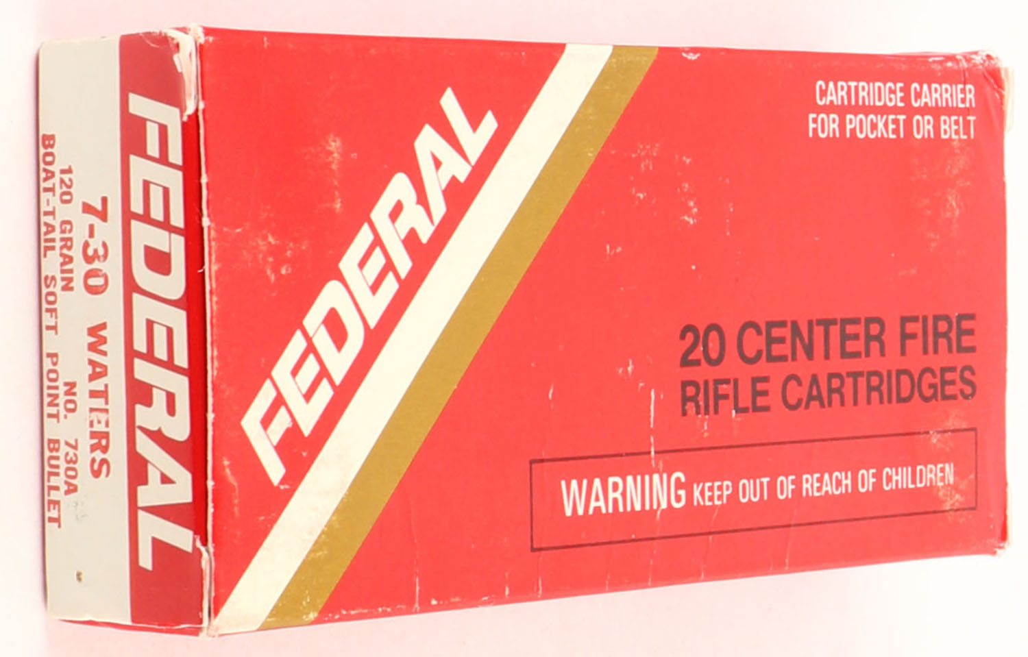 Federal, 7-30 Waters, 120 Gr. Boat-Tail Soft Point, 1pc, Full, Red, white & black box, box is very solid with light handling wear, ammo is excellent. Grade: Excellent - Value: 14 to 40