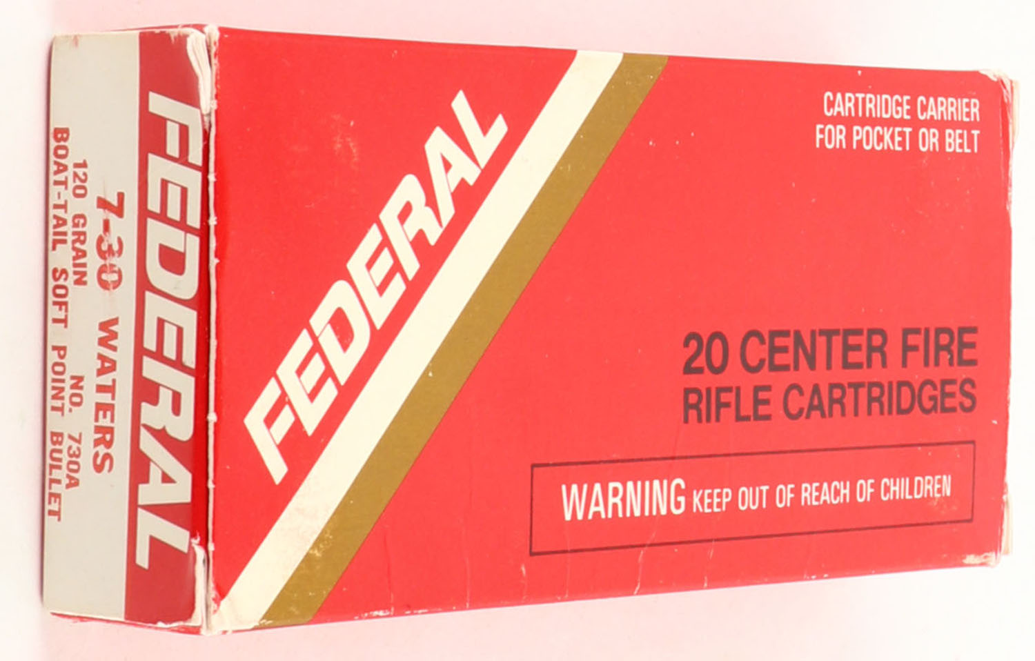 Federal, 7-30 Waters, 120 Gr. Boat-Tail Soft Point, 1pc, Full, Red, white & black box, box is very solid with light handling wear, ammo is excellent. Grade: Very Good ++ - Value: 14 to 40