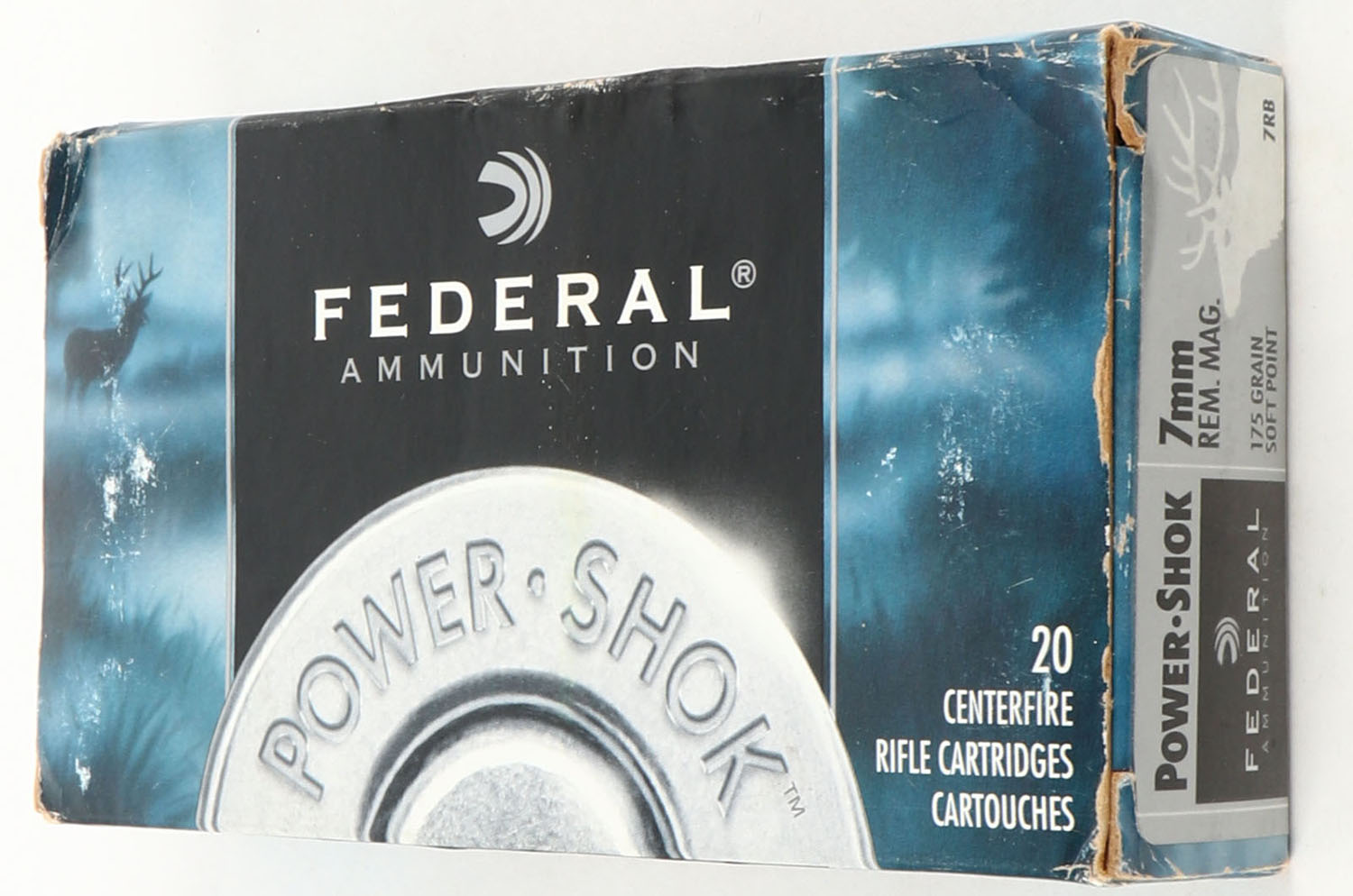 Federal, Power Shok, 7mm Rem. Mag. 175 Grain Soft Point, Full, 1pc. multi-colored box, box has scuffing with edge wear, ammo is excellent. Grade: Very Good + - Value: 20 to 60