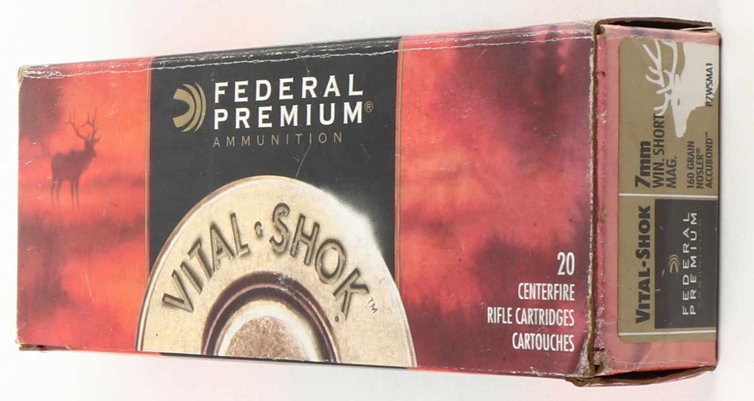 Federal, Vital-Shok, 7mm Win. Short Mag., 160 Grain Nosler Accubond, Full, 1pc. multi-colored box, box has some age soiling with minor corner wear, ammo is excellent. Grade: Very Good ++ - Value: 20 to 60