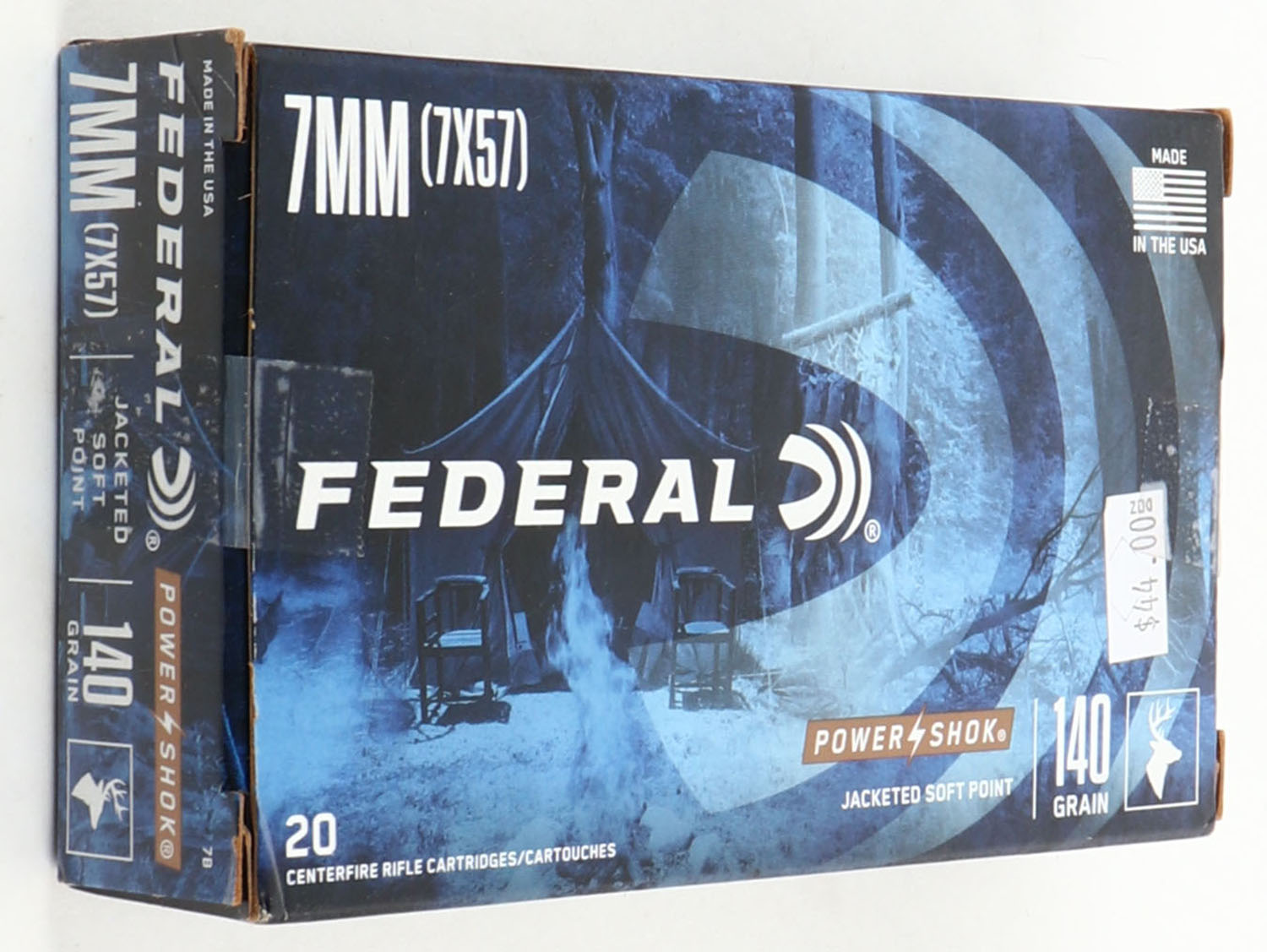 Federal, Power Shok, 7mm, 140 Grain JSP. Full, 1pc. Multi-colored box, box is solid with excellent color, ammo is minty. Grade: Excellent ++ - Value: 16 to 60