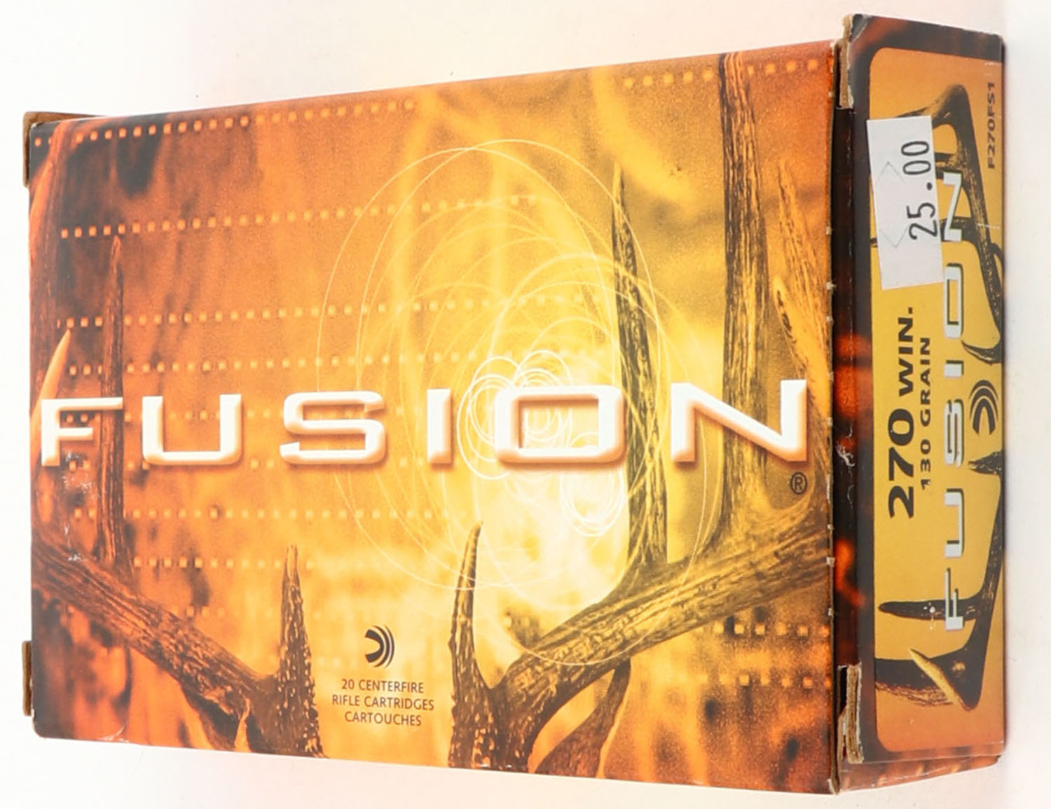 Federal, Fusion, 270 Win., 130 Grain, Full, 1pc., multi-colored box, box is solid with great color, end flaps are solid, ammo is excellent. Grade: Excellent ++ - Value: 16 to 60