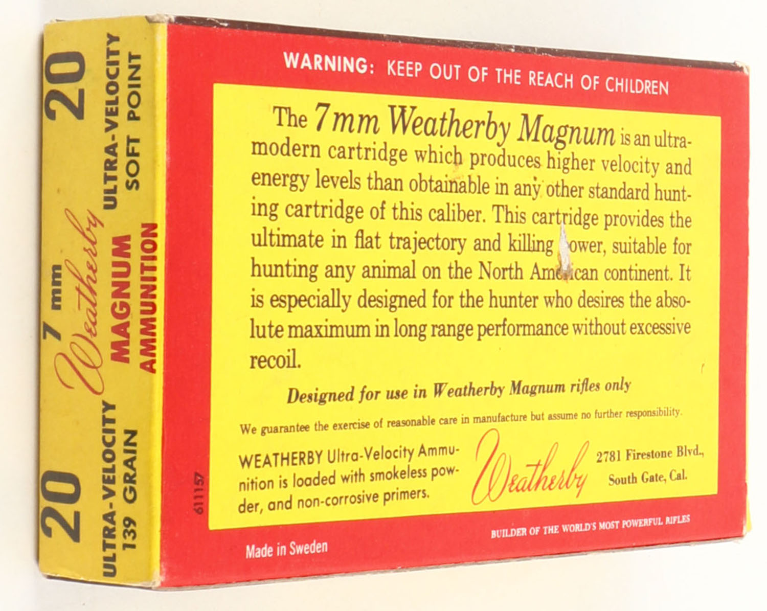 Weatherby, Ultra-Velocity Ammunition, 7mm Weatherby Magnum, 139 Grain Ultra Velocity Soft Point, Full, 1pc., multi-colored box, box is solid with very good color, very light shelf wear, end flaps are solid, ammo is excellent. Grade: Excellent - Value: 30 to 90
