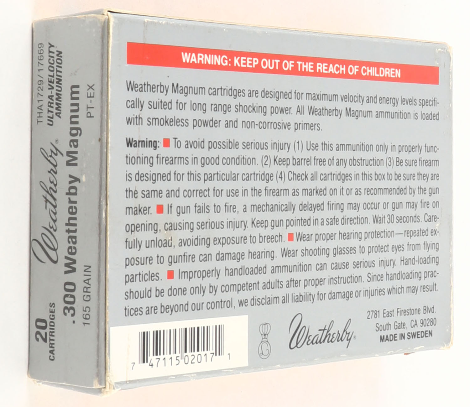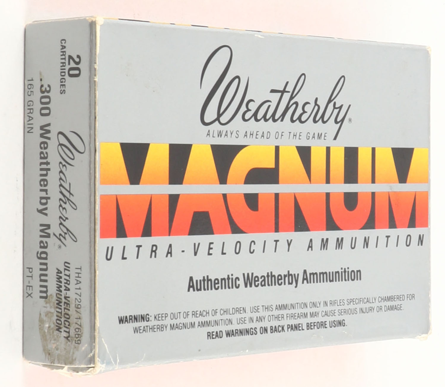Weatherby, Magnum, .300 Weatherby Magnum., 165 Grain PT-EX, Partial 19rds, 1pc. multi-colored box, box is solid with excellent color, Ammo is excellent. Grade: Excellent - Value: 20 to 80