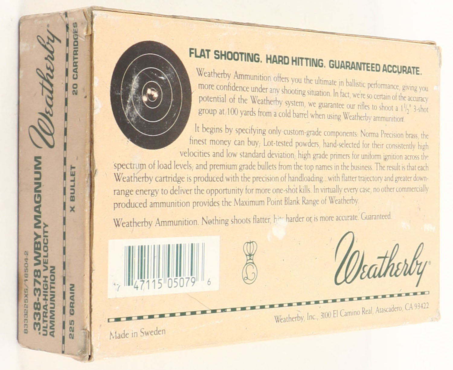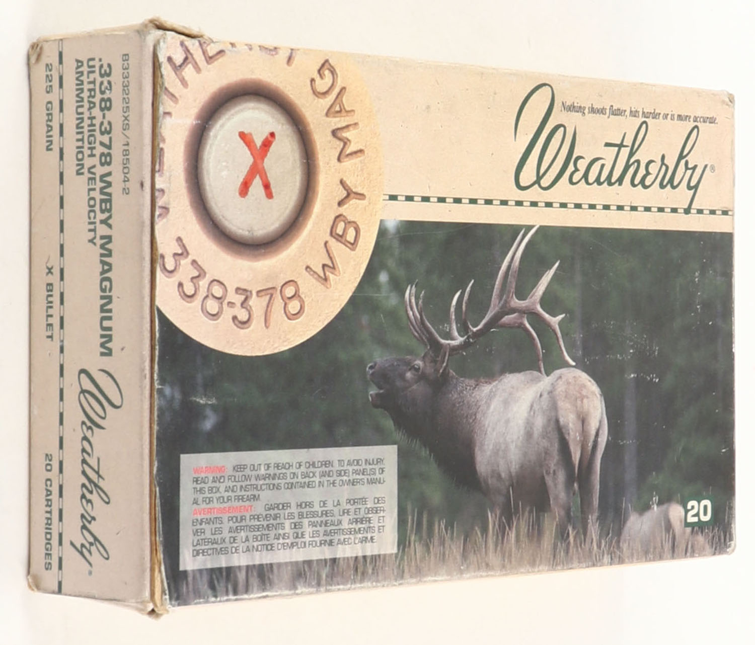 Weatherby, 338-378 Weatherby Magnum, 225 Grain X Bullet, Partial 19rds. With 11rds being fired, 1pc. multi-colored box, box has age soiling with light scuffing, ammo is very good. Grade: Very Good - Value: 20 to 60