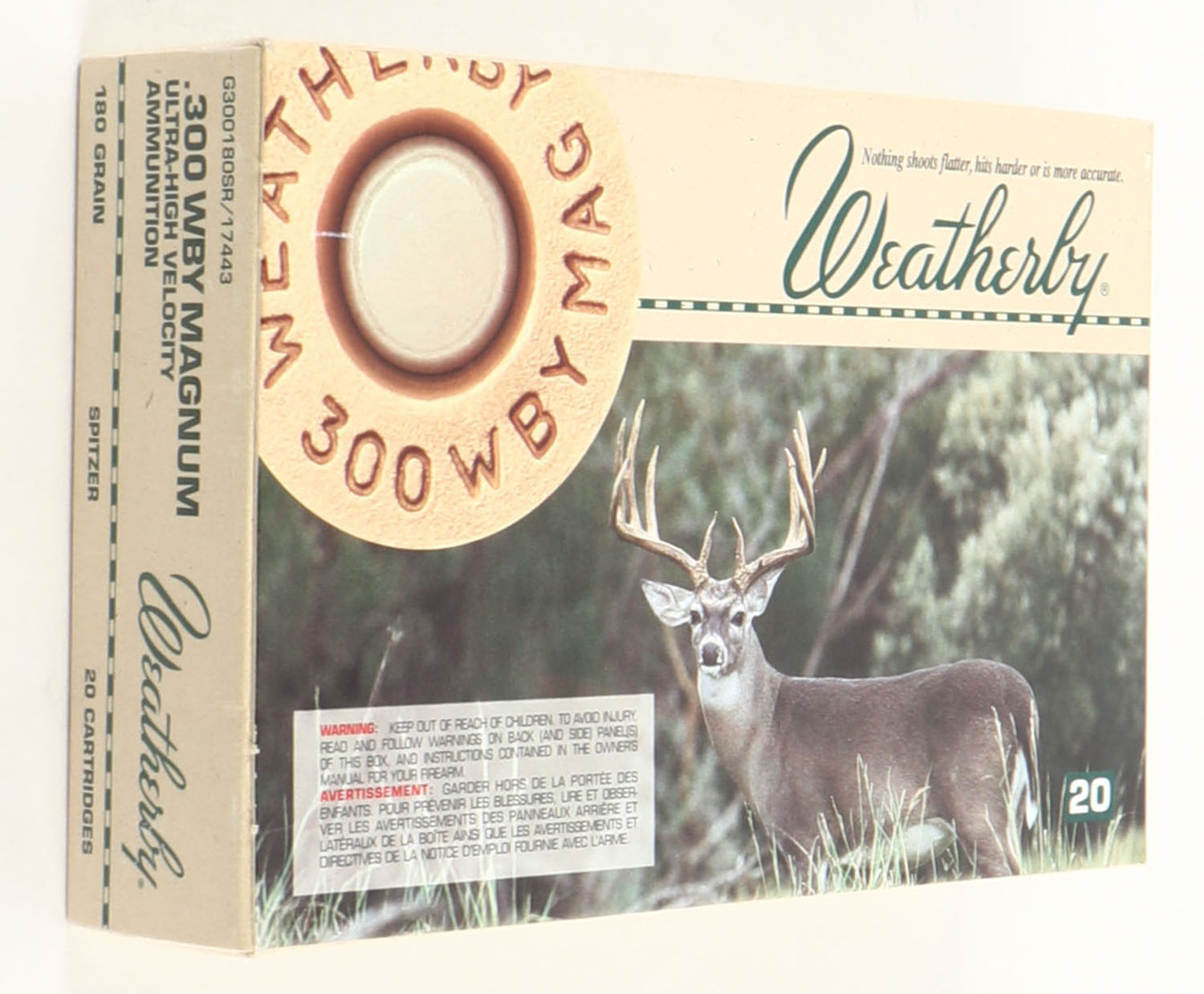 Weatherby, .300 Weatherby Magnum, 180 Grain Spitzer, Full, 1pc., multi-colored box, box is very solid with excellent color, ammo is minty. Grade: Excellent ++ - Value: 30 to 90