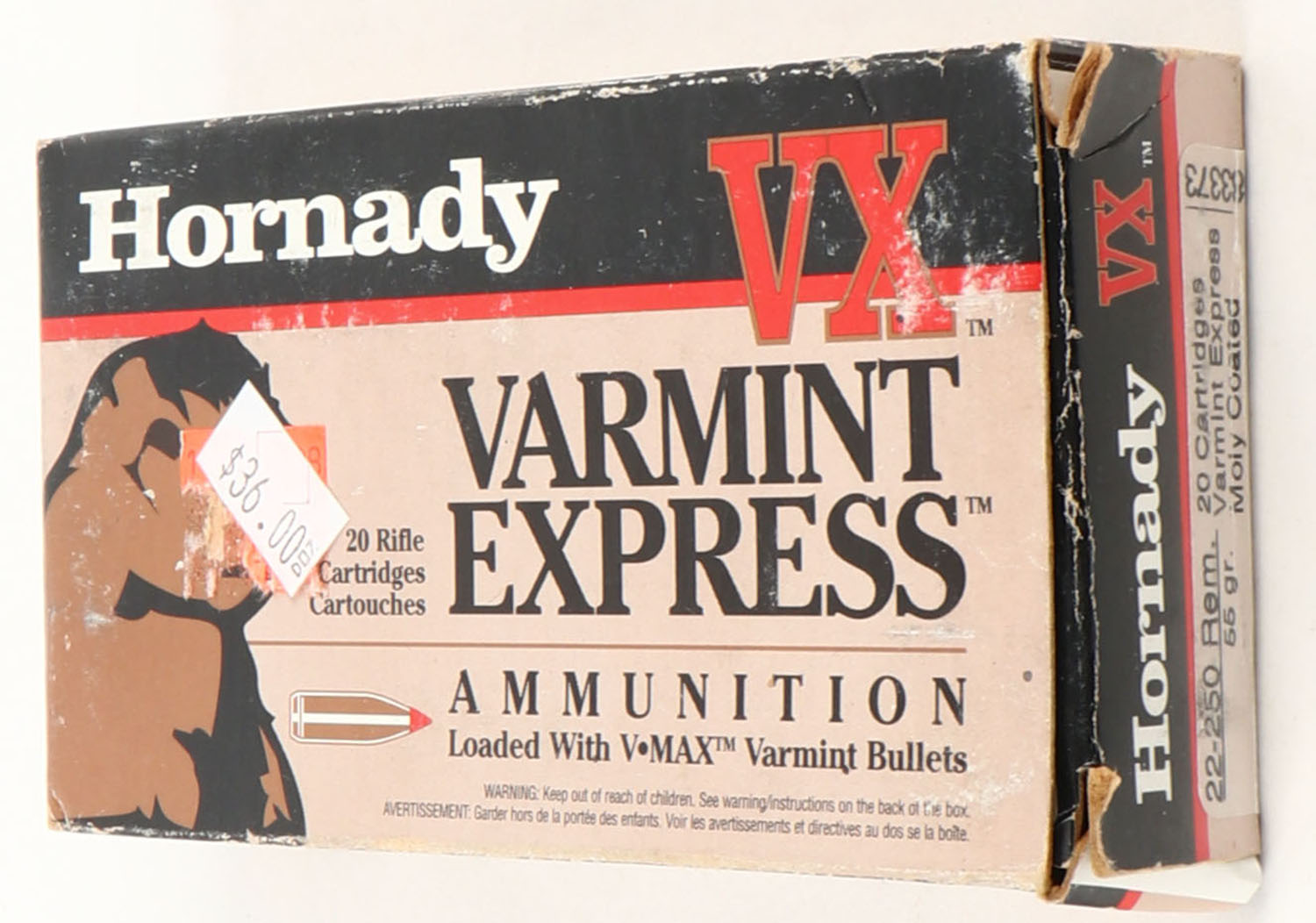 Hornady, Varmint Express, 22-250 Rem., 55 Grain, Full, 1pc, multi-colored box, box has age soiling with scuffing, end flaps are solid, ammo is excellent. Grade: Very Good - Value: 20 to 80