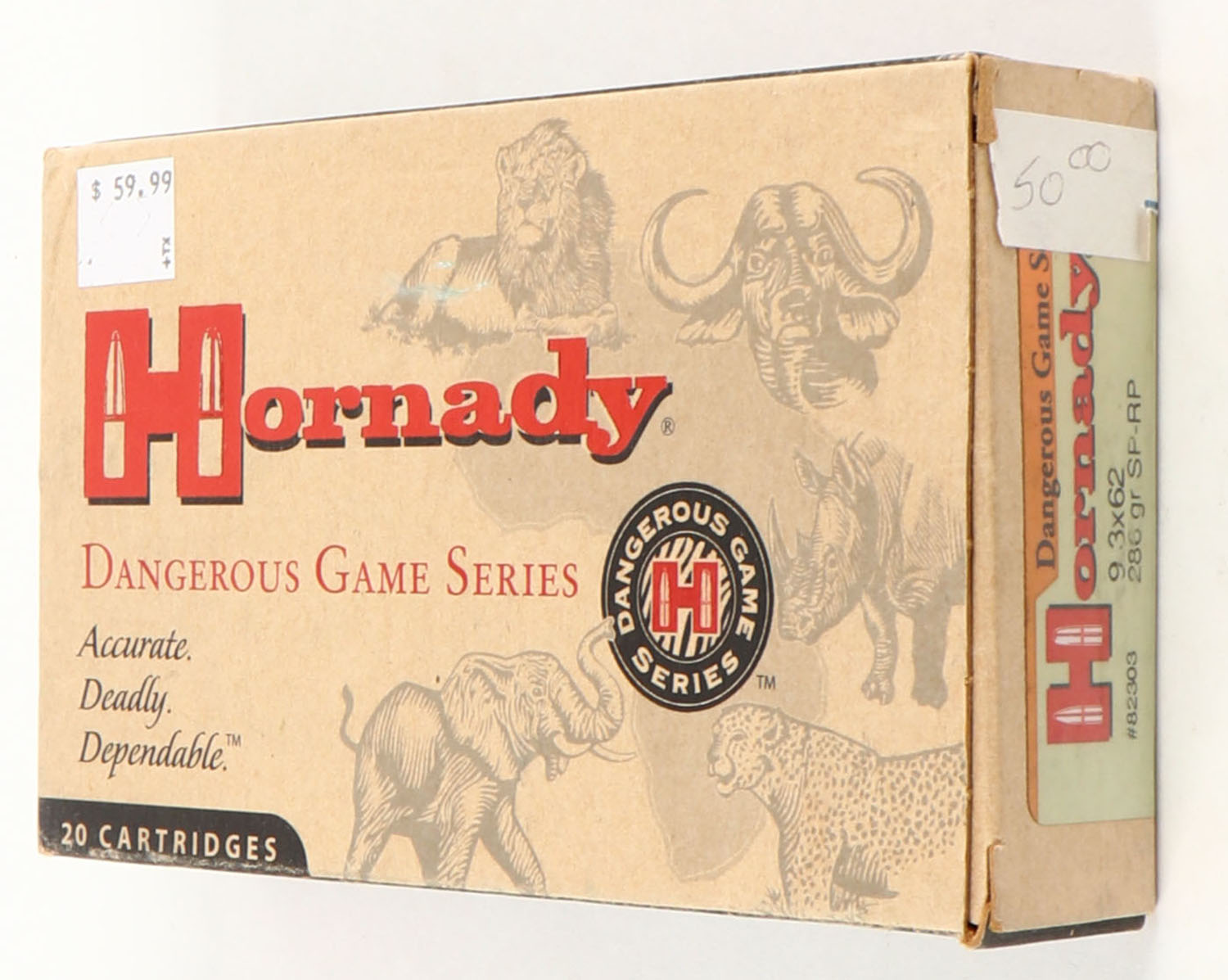 Hornady, Dangerous Game Series, 9,3 x 62, 286 Grain SP-RP, Full, 1pc., multi-colored box, box is very solid with excellent color, ammo is minty. Grade: Excellent ++ - Value: 40 to 120