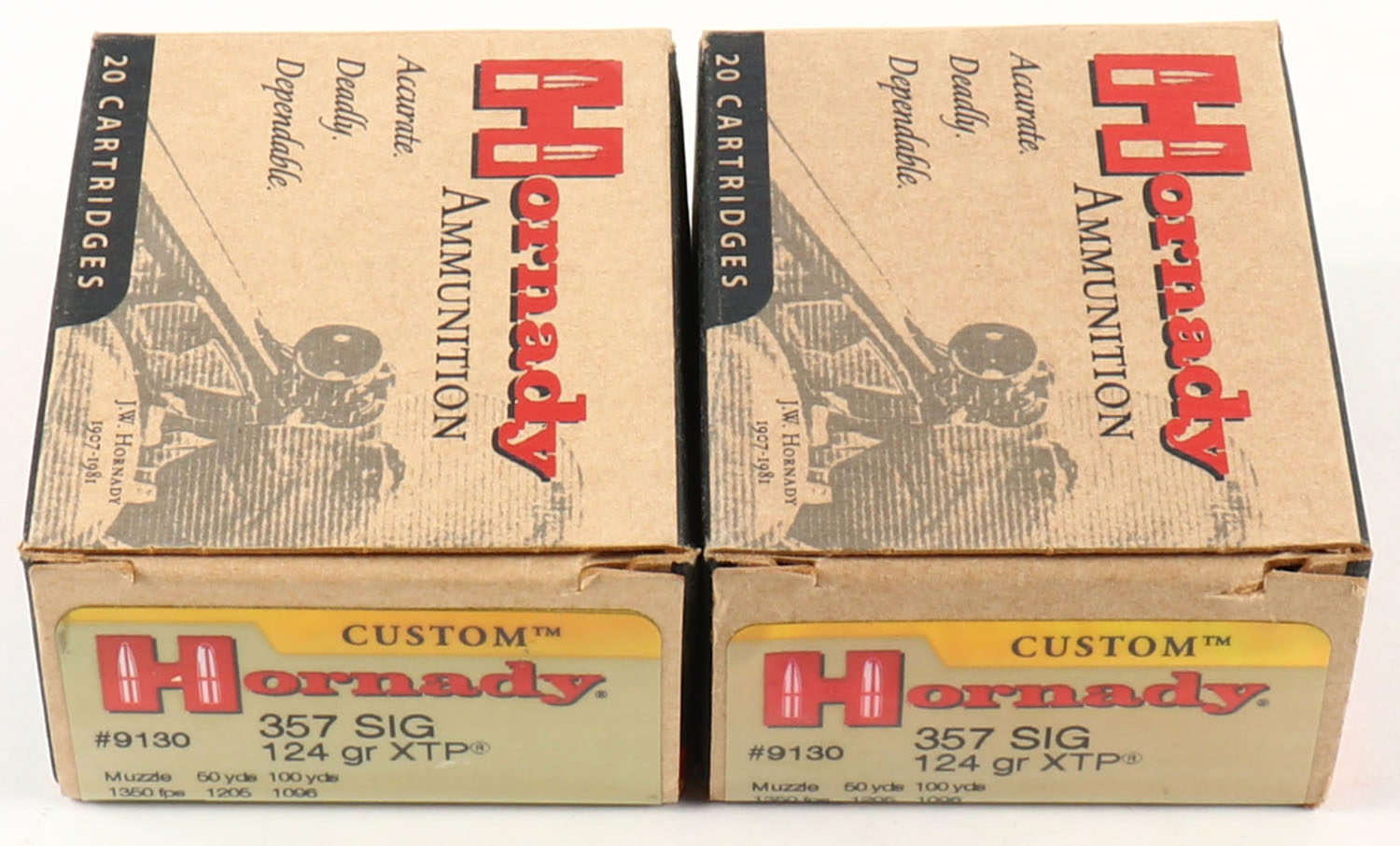 Hornady, Lot of (2), Custom, .357 Sig., 124 grain XTP, Full, 1pc., multi-colored box, boxes are very solid with excellent color, ammo is excellent. Grade: Excellent ++ - Value: 20 to 60