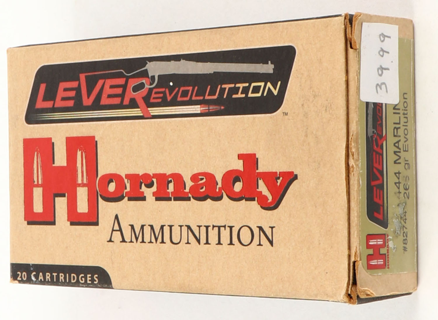 Hornady, LeverEvolution, .444 Marlin, 265 Grain Evolution, Full with 11rds being correct, 1pc. multi-colored box, box is solid with excellent color, Ammo is very good. Grade: Very Good + - Value: 20 to 80