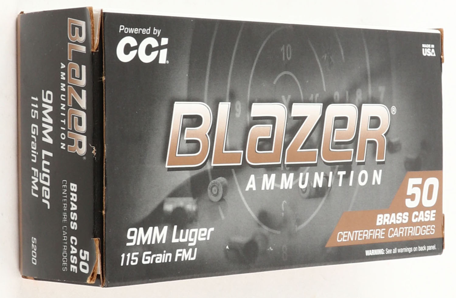 CCI, Blazer Brass, 9mm Luger, 115 Grain FMJ, Full, 1pc. multi-colored box, box is solid with excellent color, Ammo is excellent. Grade: Excellent ++ - Value: 10 to 40