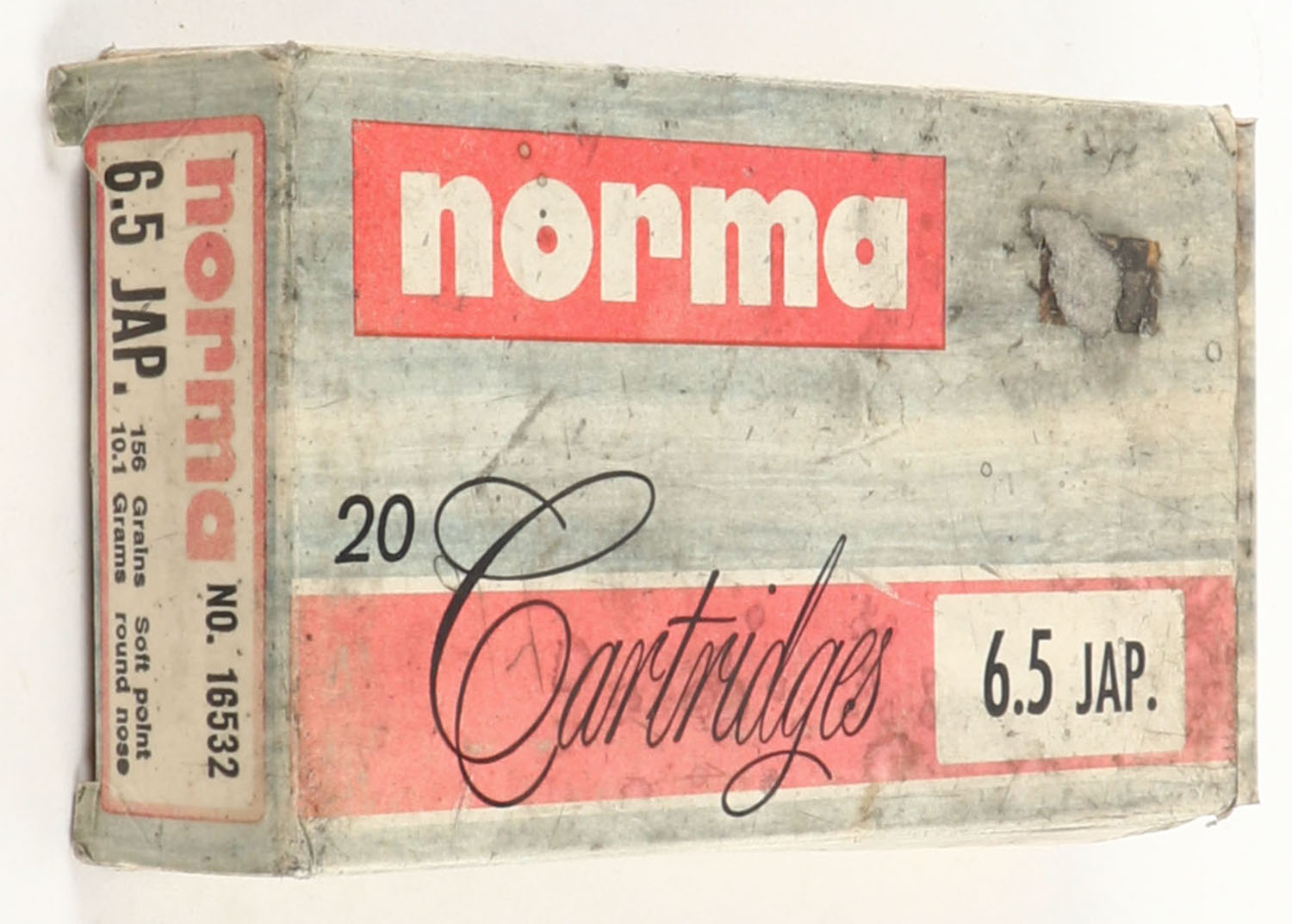 Norma, 6.5 JAP, 156 Grains Soft Point, Partial 19rds., 1pc. multi-colored box, box has soiling with scuffing, Ammo is good. Grade: Good - Value: 20 to 60
