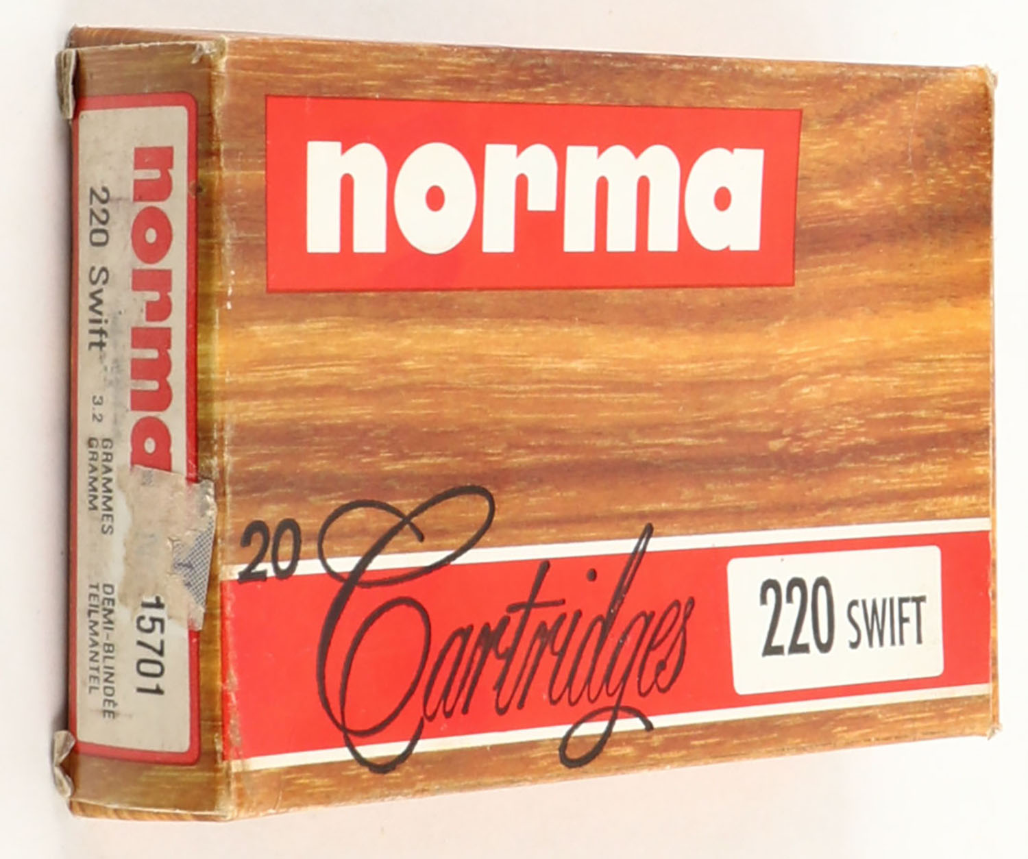 Norma, 220 Swift, 50 Gr. Soft Point, Full, 1pc. multi-colored box, box is very solid, Ammo is excellent. Grade: Excellent + - Value: 20 to 60