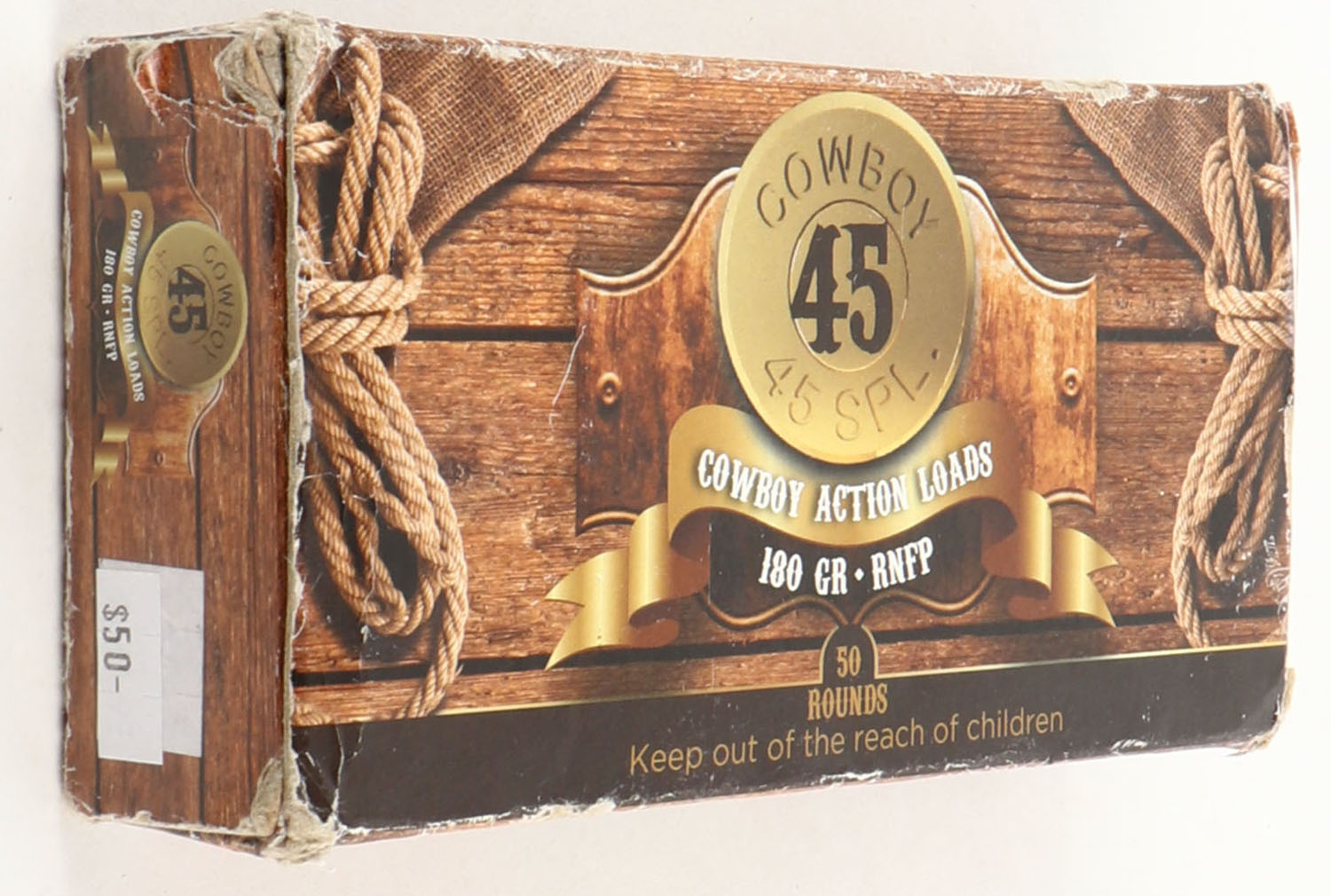 Cowboy Action Loads, .45 SPL., 180 Gr., Full, 1pc., multi-color box, box has edge wear with scuffing, ammo is excellent. Grade: Very Good - Value: 20 to 60