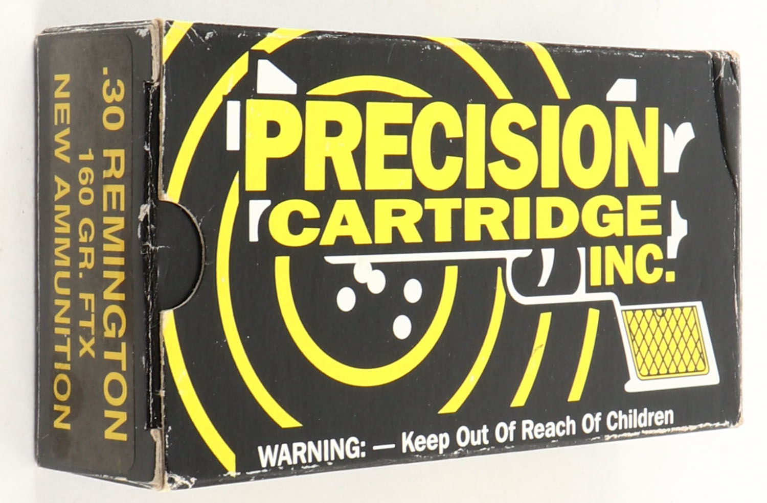 Precision Cartridge Inc. .30 Rem. 160 Gr. FTX, Full, 1pc., multi-colored box, box has edge wear with scuffing, ammo is excellent. Grade: Very Good ++ - Value: 50 to 200