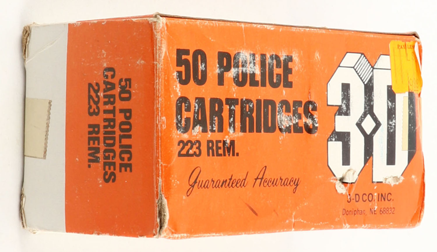 3-D Co. Inc., Police Cartridges, .223 Rem., Full, 1pc., multi-colored box, box has light soiling, ammo is very good. Grade: Very Good - Value: 16 to 60