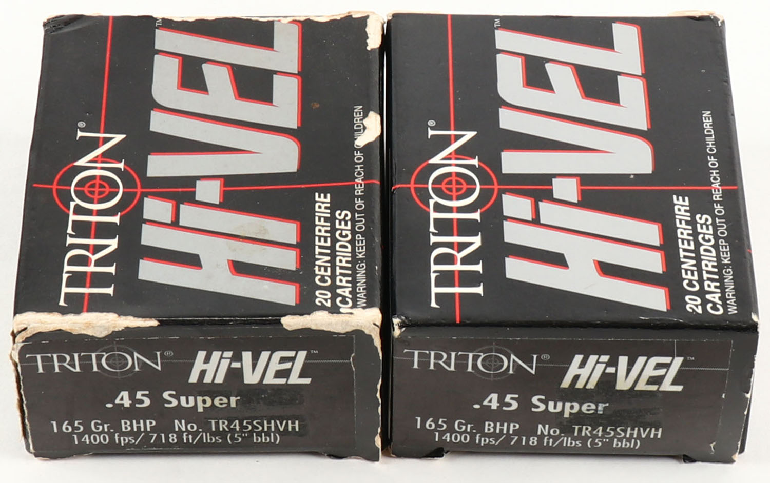 Triton, Lot of (2), Hi-Vel, .45 Super, 165 Grain BHP, Full, 1pc, multi-colored boxes, boxes are solid, ammo is excellent. Grade: Very Good + - Value: 16 to 60